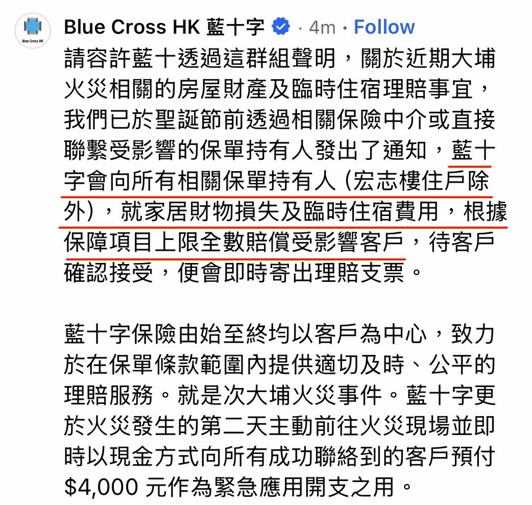 此外,社交平台ifc89f@threads隨後引述另一間保險公司消息,配文道:「突發!AIA旗下嘅藍十字成為第一間公開表明以「家居財物損失」及「臨時住宿費用」保障項目上限,向宏福苑災民作出全數賠償嘅保險公司!」