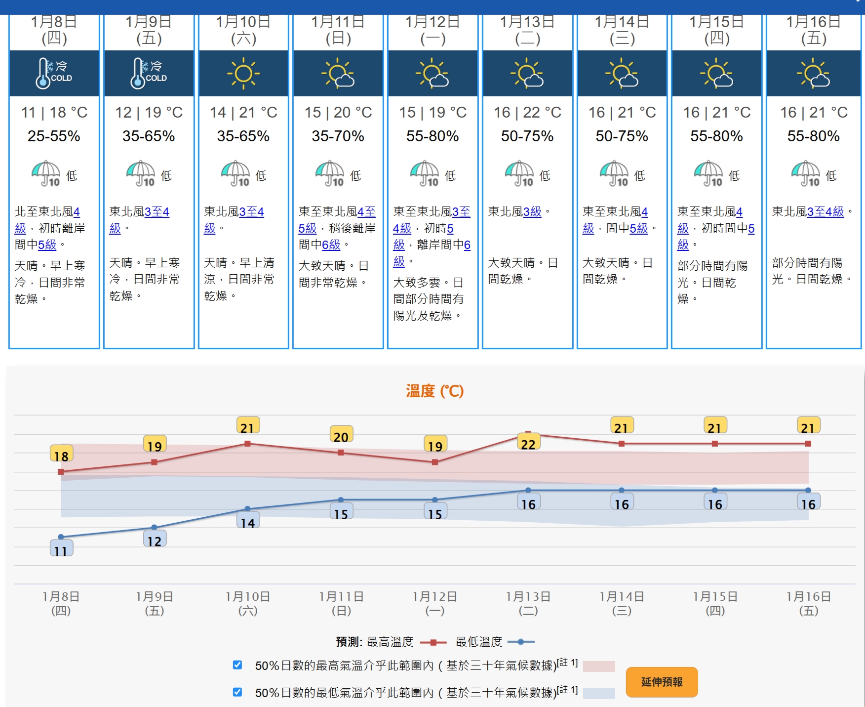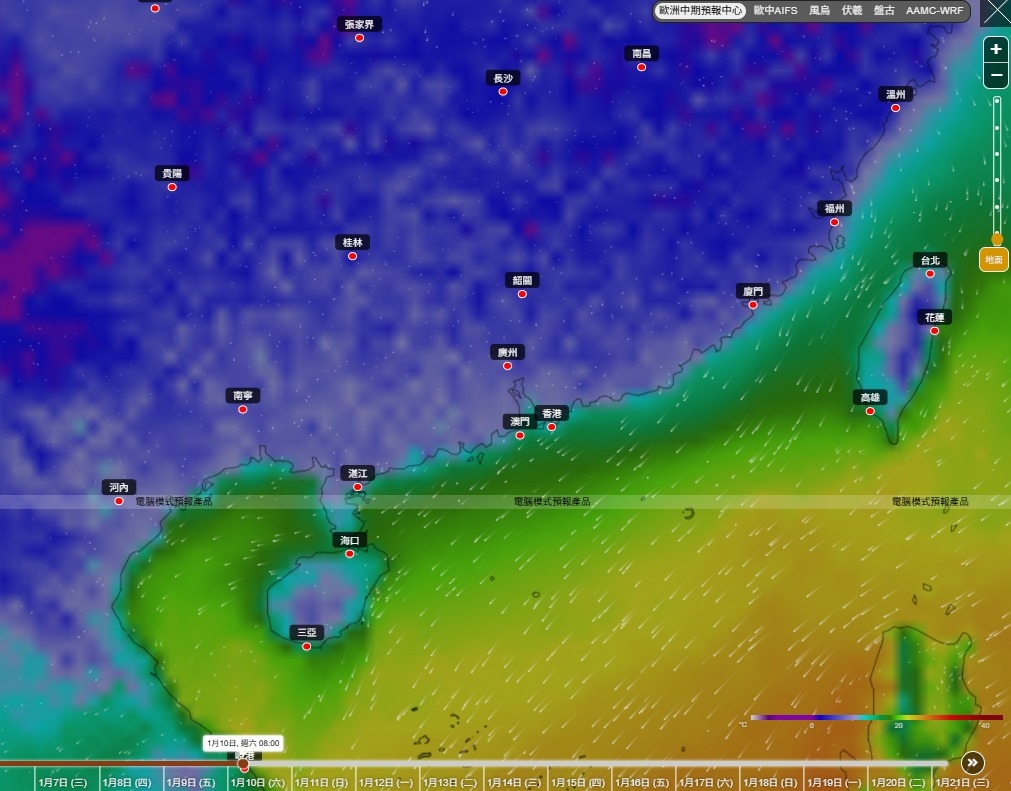 另一方面,根據香港天文台最新的九天天氣預報則未有預測會出現極端低溫情況,而根據天文台網站地球天氣,歐洲中期預報中心的預測亦只顯示1月10日香港為粉藍色,即最低溫度預計約10度以上。