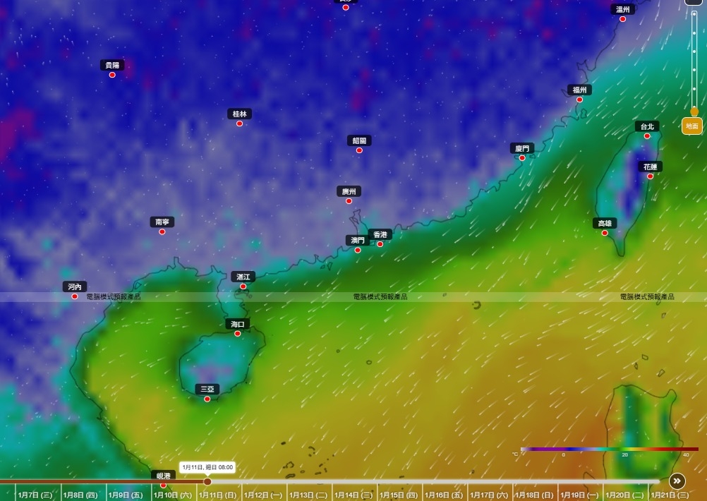 網上近日流傳宣稱來自歐洲中期預報中心(ECMWF)的電腦模型預測圖,該模型預測一股強烈東北季候風可能於一月中下旬影響華南地區。模型數據預測更顯示,屆時香港鄰近地區的低溫可能逼近5至8度,而北面更廣泛地區呈現深藍色(即攝氏0度)。模型指出,在1月10日至15日期間,強風可能加劇風寒效應,使體感溫度更低,不少網民更因此引發香港落雪疑團。