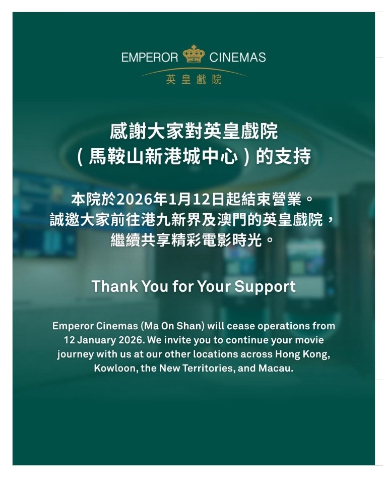 香港零售市道低迷,單是2025年,已經有不同規模的電影院相繼結業。早兩日,有馬鞍山居民網傳區內的英皇戲院並沒有提供本周的電影場次;終於直至今早,英皇戲院正式公布,旗下馬鞍山英皇戲院,今日起結束營業。