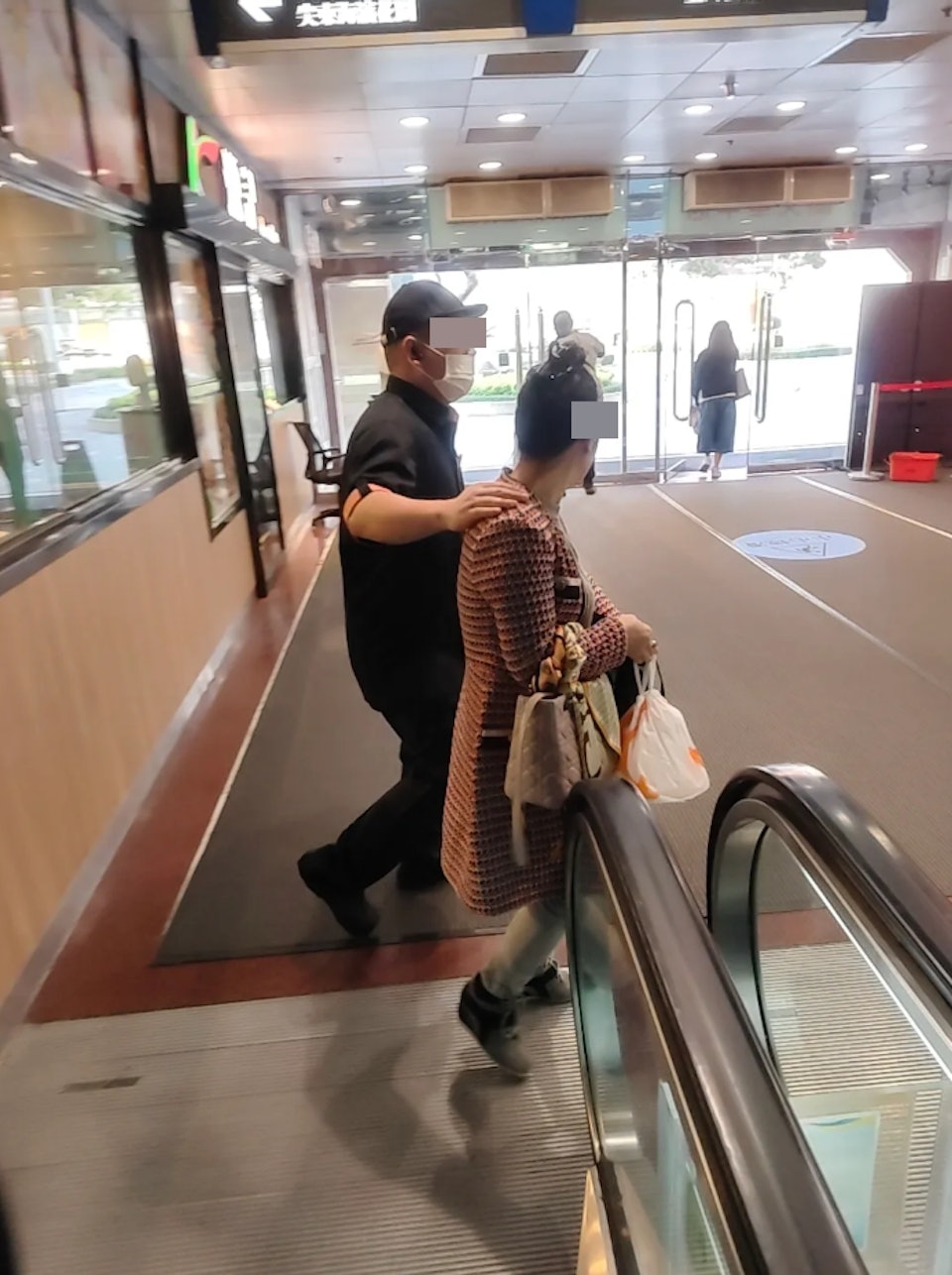 該圖片中可見,現場為新文華中心大門近扶手電梯的位置,1名手挽粉紅色疑似Dior名牌袋的女子,手持1袋以大X活膠袋裝著的食物,而她身後有1名男職員,以右手搭着其膊頭,該名女子則未有露出特別神情。
