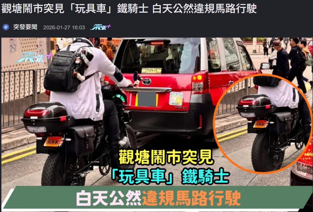 東張日前 (1月27日) 報道,白天觀塘鬧市一名鐵騎士駕駛一輛掛上「玩具車」車牌的車輛於紅燈前停下,公然違規於馬路行駛。