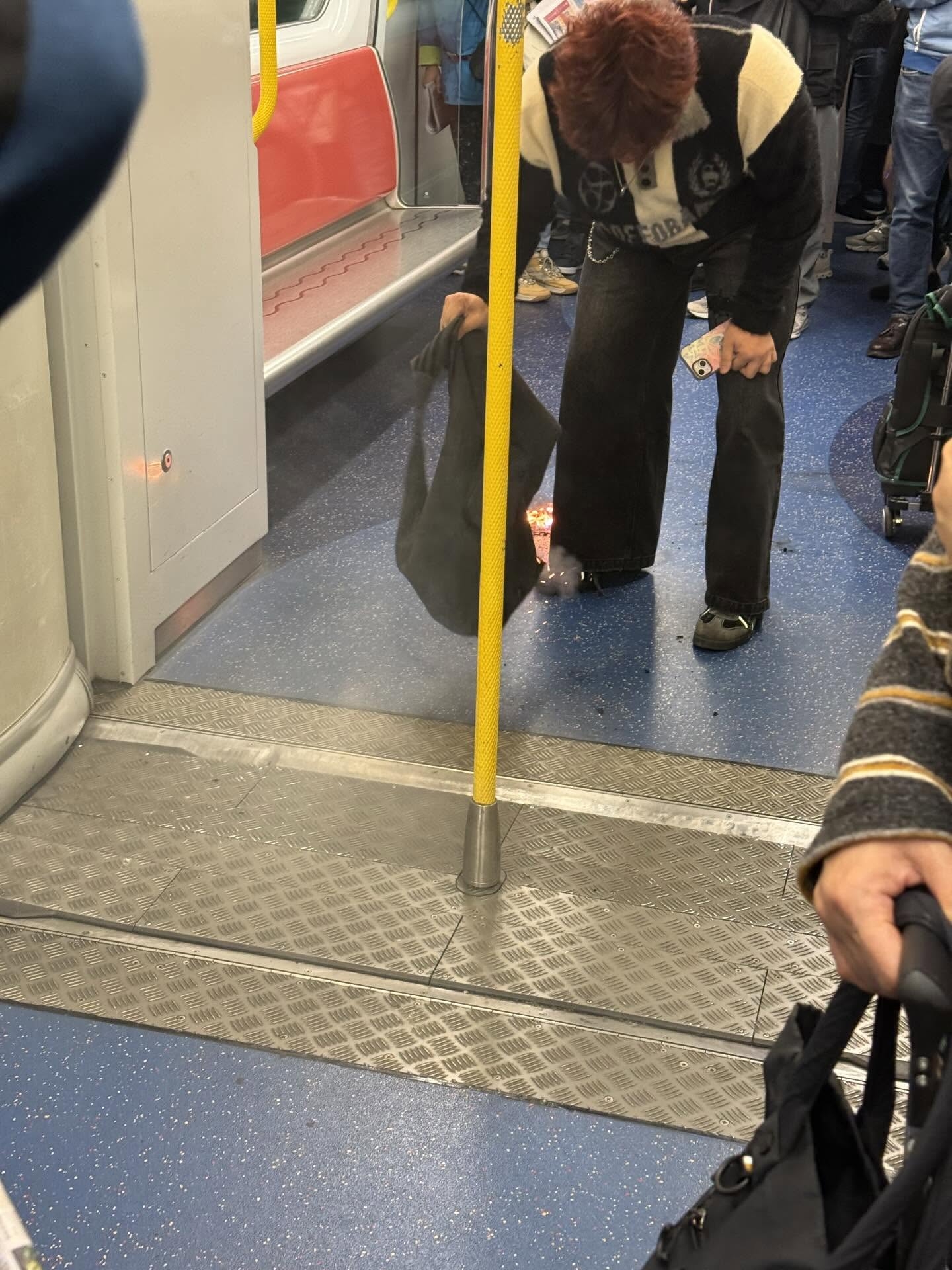事發在今早8時許,荃灣西站一列列車上,車廂內一名女乘客的充電器突然起火,連帶該名女乘客的布袋也被燒著。