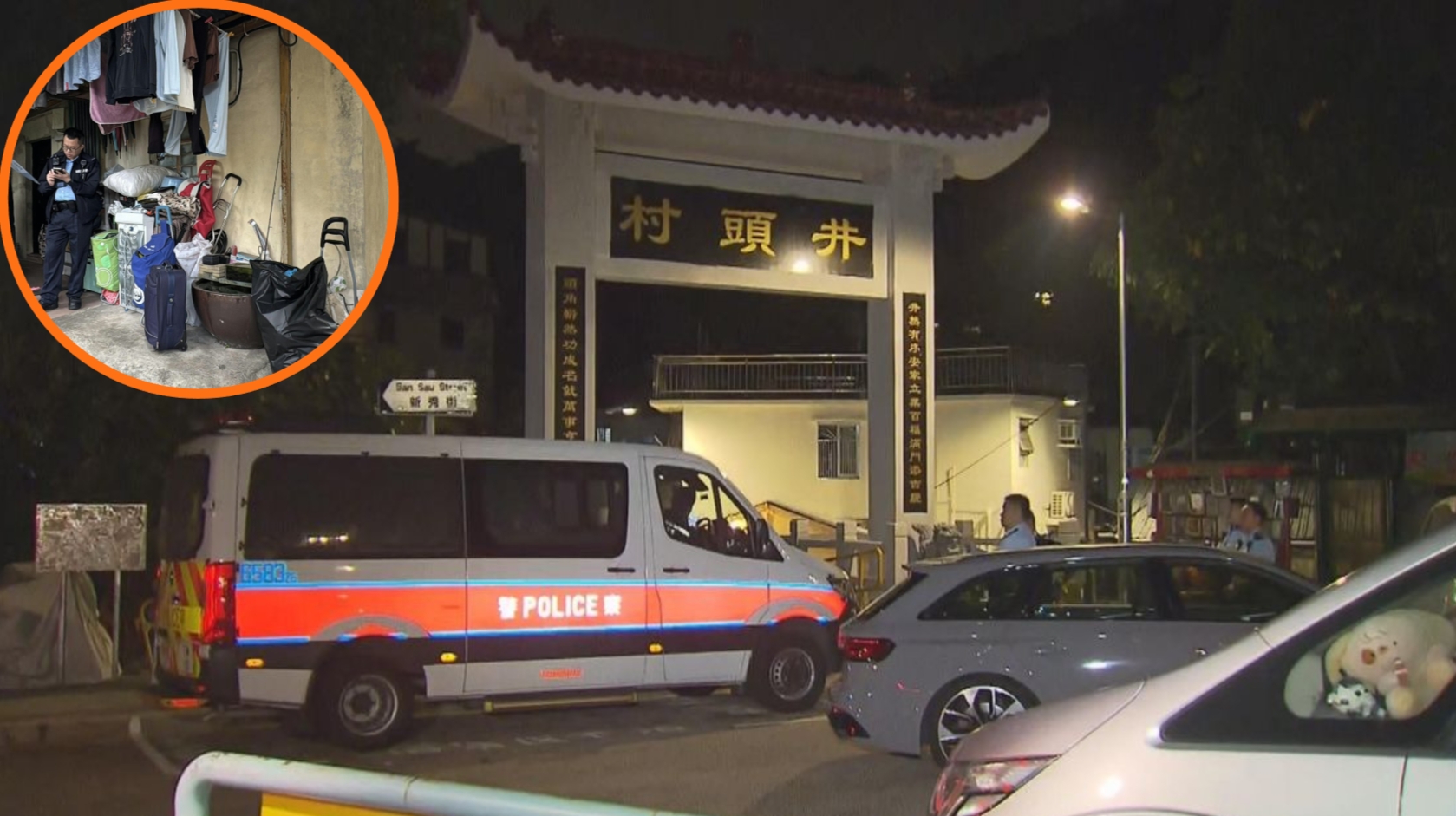 事發在新秀街井頭中村一間村屋,現場被圍封。大批警員到場調查,並且到涉事村屋外圍搜證。