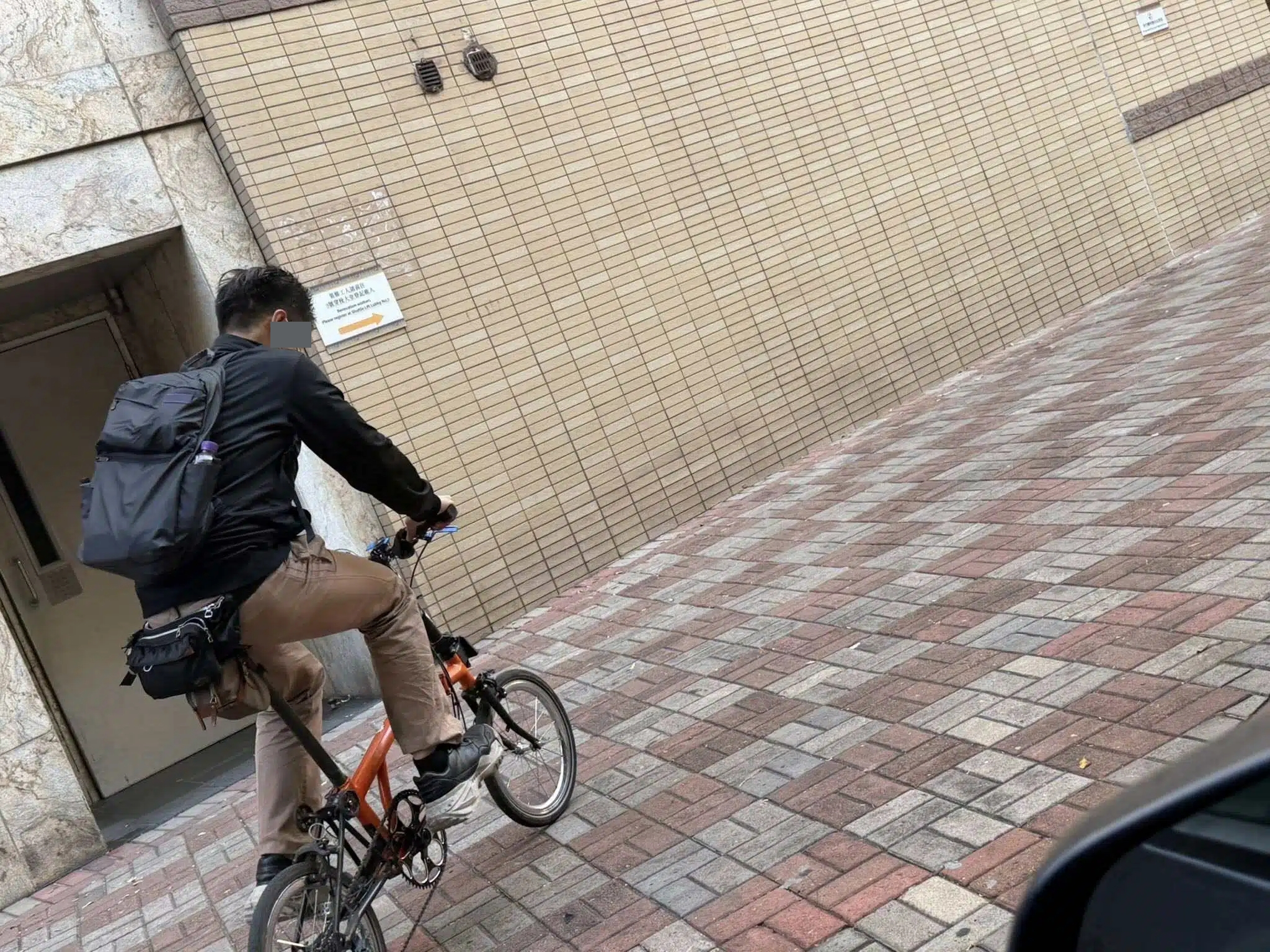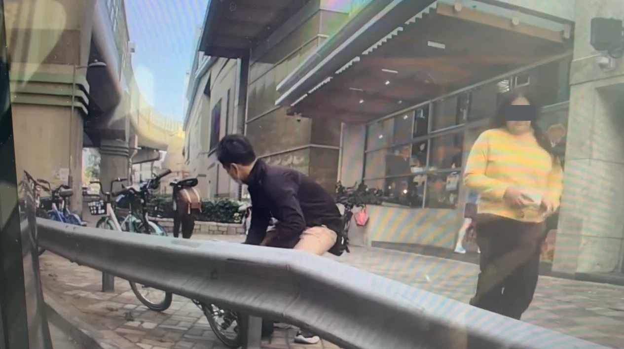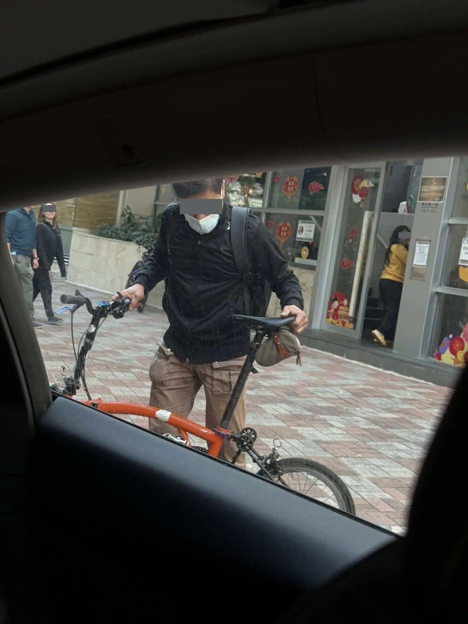 事發地點相信是大圍住宅「名城」一帶的行人路, 一名身穿黑色長袖外衣啡色長褲戴口罩的短髮男子,懷疑光天化日無視人來人往,以重型工具剪斷路邊停泊單車的鐵鏈,懷疑公然偷走一輛橙色車架的單車。