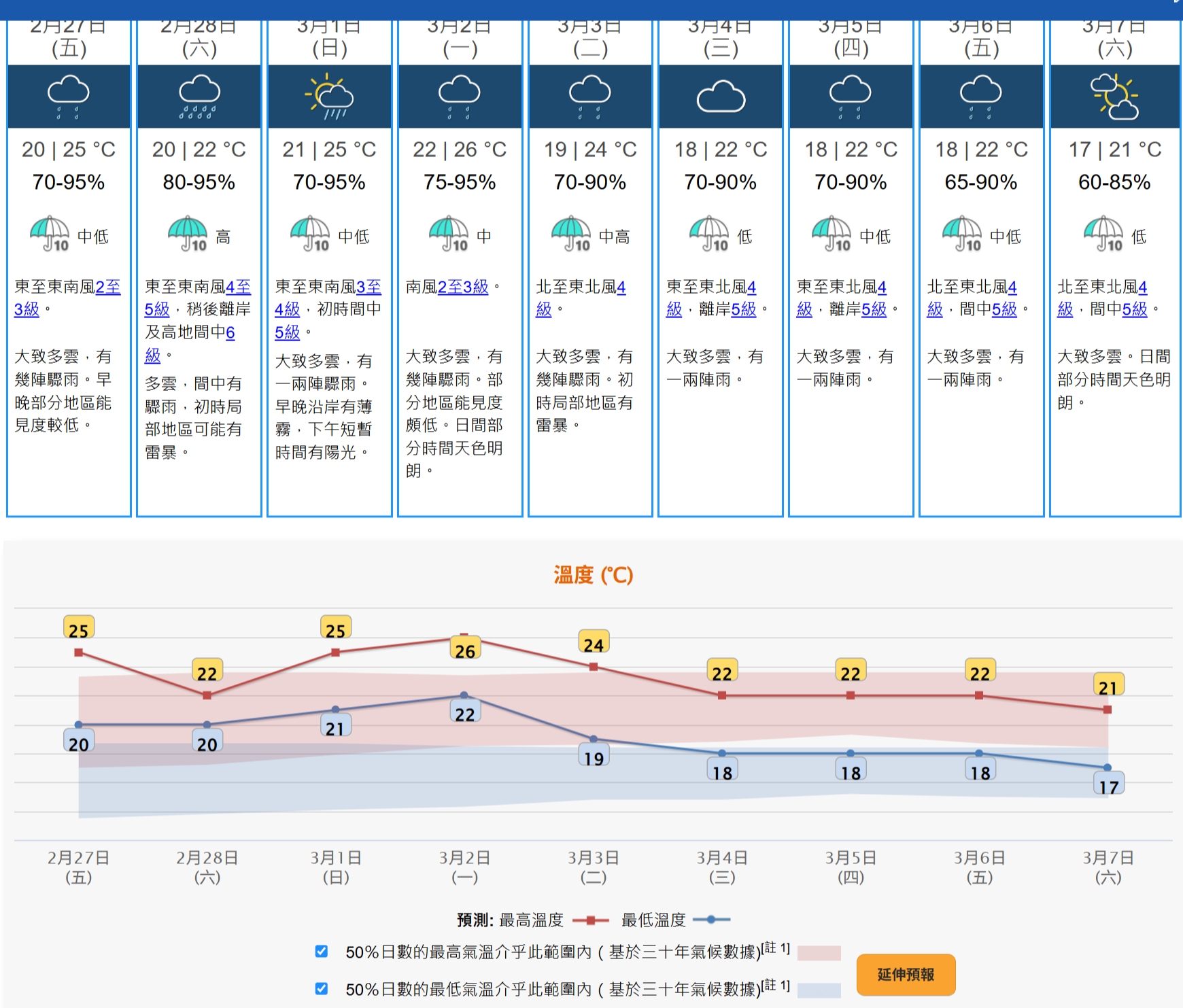 天文台展望明日 (2月27日) 有幾陣驟雨,星期六 (2月28日) 初時驟雨較多,稍後東風增強,隨後一兩日仍有幾陣驟雨,天氣潮濕。