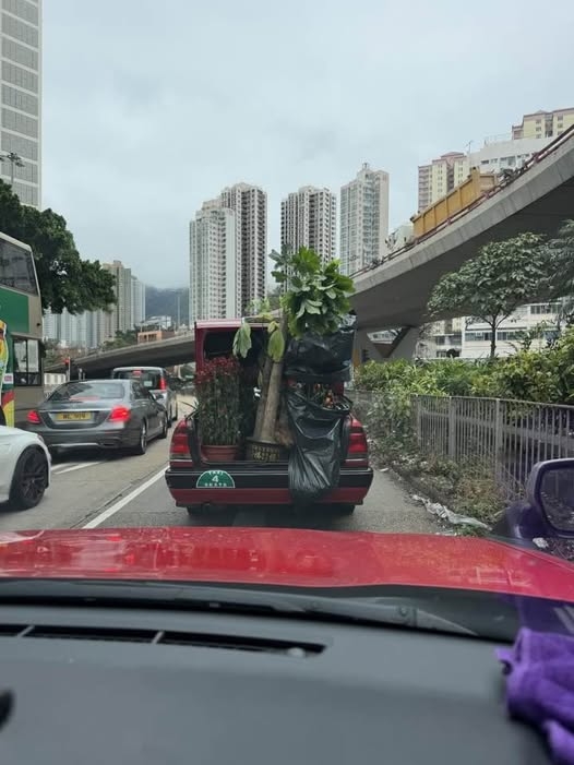 該圖片中可見,香港一部紅色市區的士,其車尾箱運載多盆大型植物彷如「森林」,極為誇張,並且對自身及其他道路使用者構成危險。