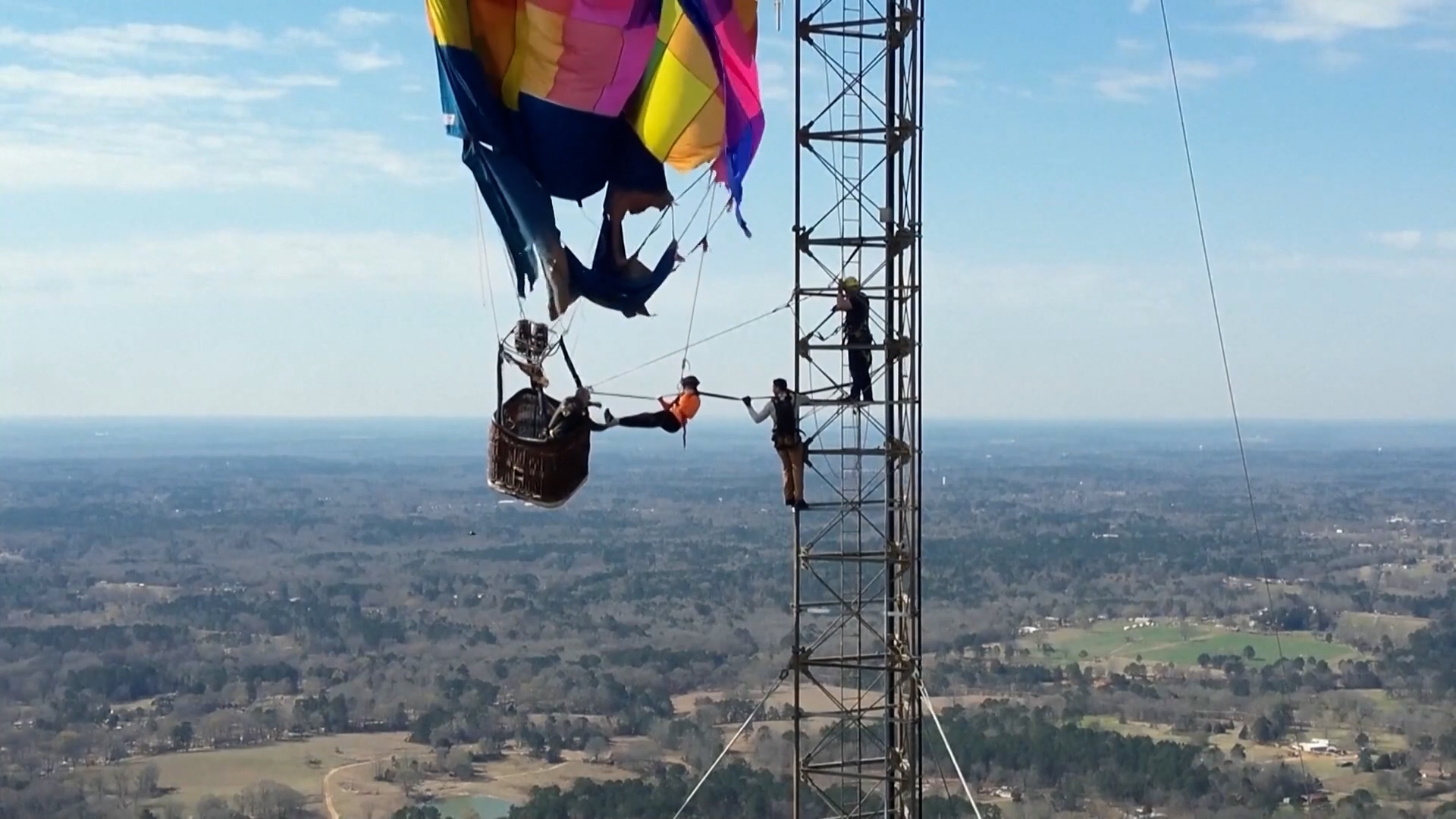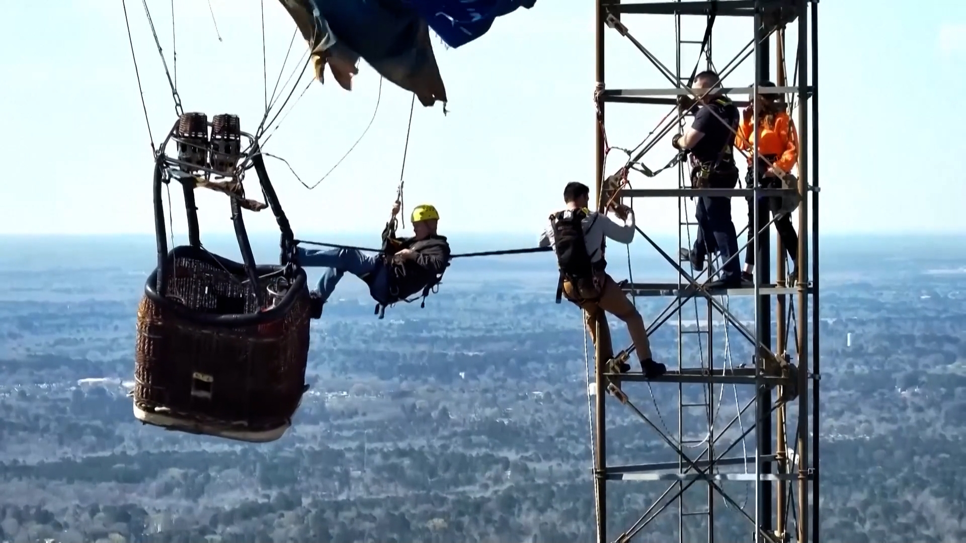 美國德州兩名乘客乘坐熱氣球時撞上德州信號塔,兩人被困在920英尺(約280公尺)的高空。
