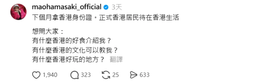據了解,現年32歲的濱崎真緒近日在threads發帖透露,宣布自己下個月將拿取香港身份證,正式以香港居民身份留在香港生活,她特地用中文發帖,向廣大網民請教「有甚麼香港的好食介紹我?有甚麼香港的文化可以教我?有甚麼香港好玩的地方?」。