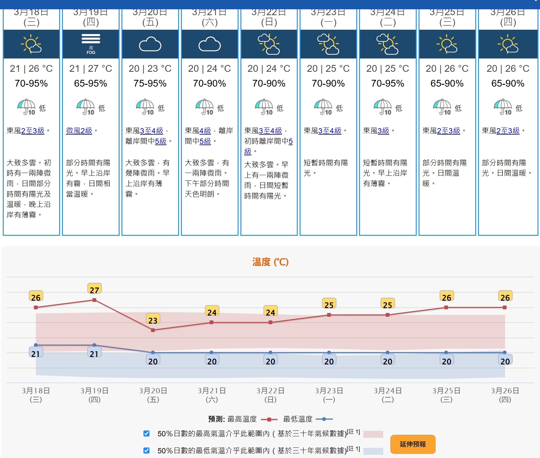 事實上,根據天文台最新九天天氣預報顯示,周三 (3月18日) 起最少連續9天的天氣潮濕,其中周四及周五「春分」的相對濕度也高達95%。
