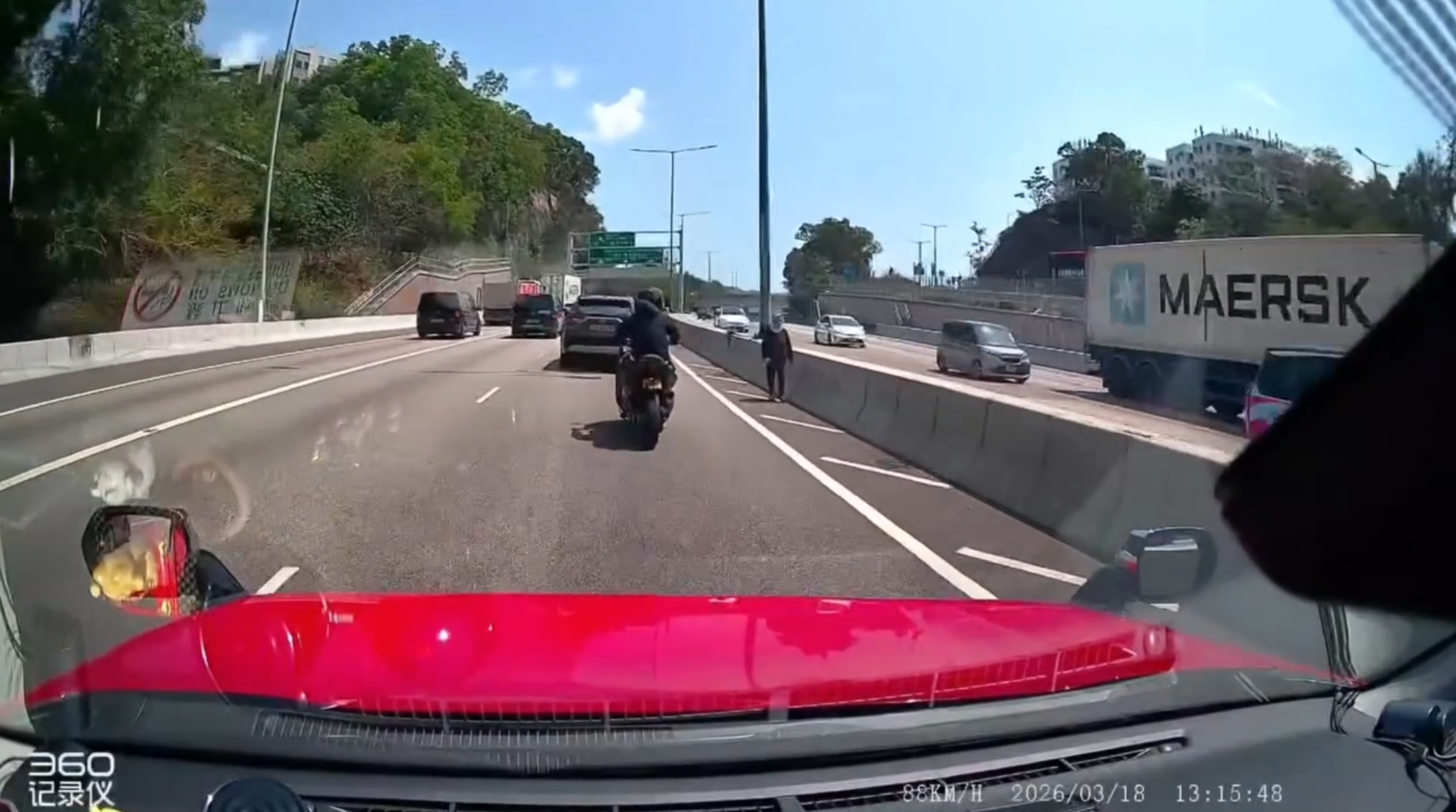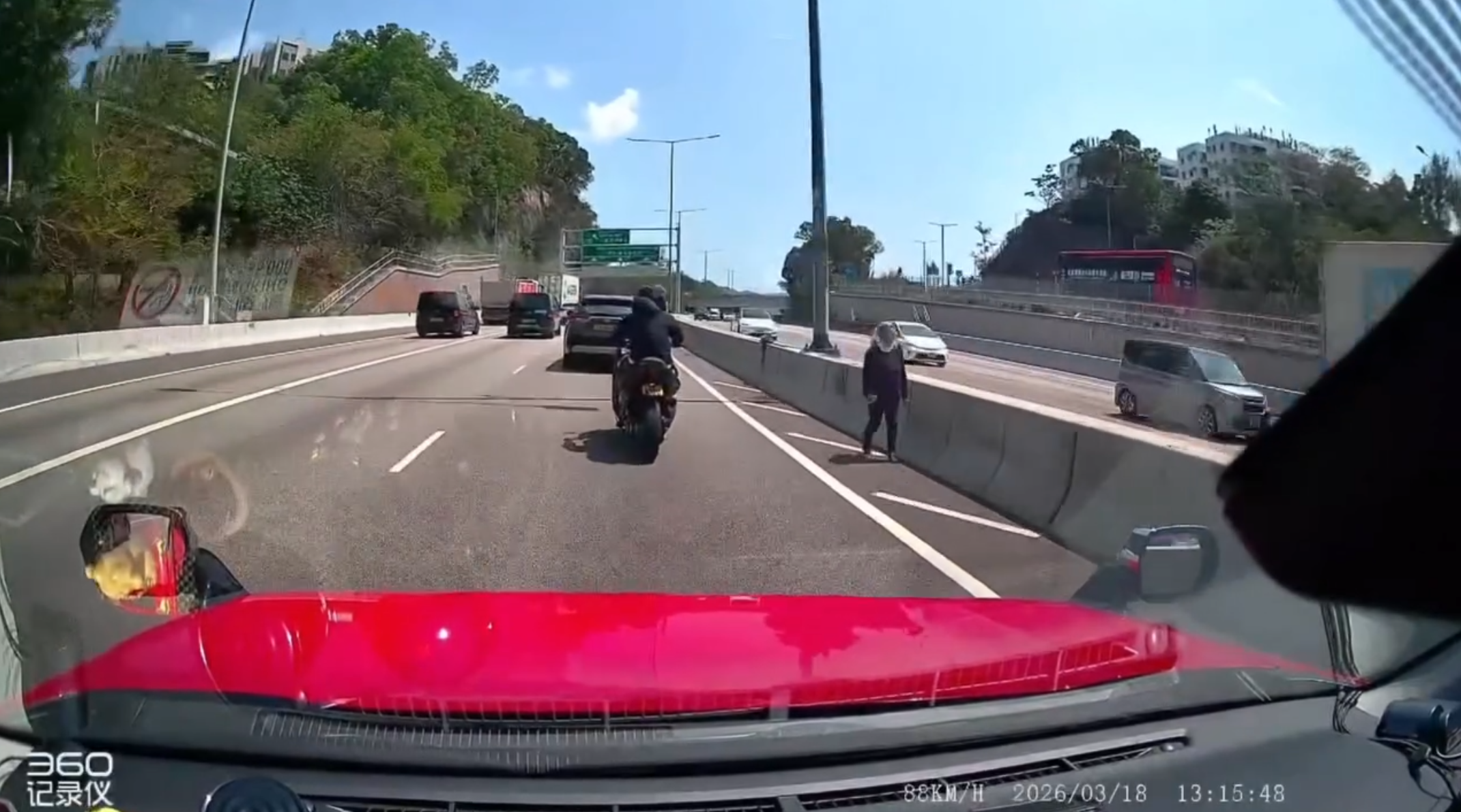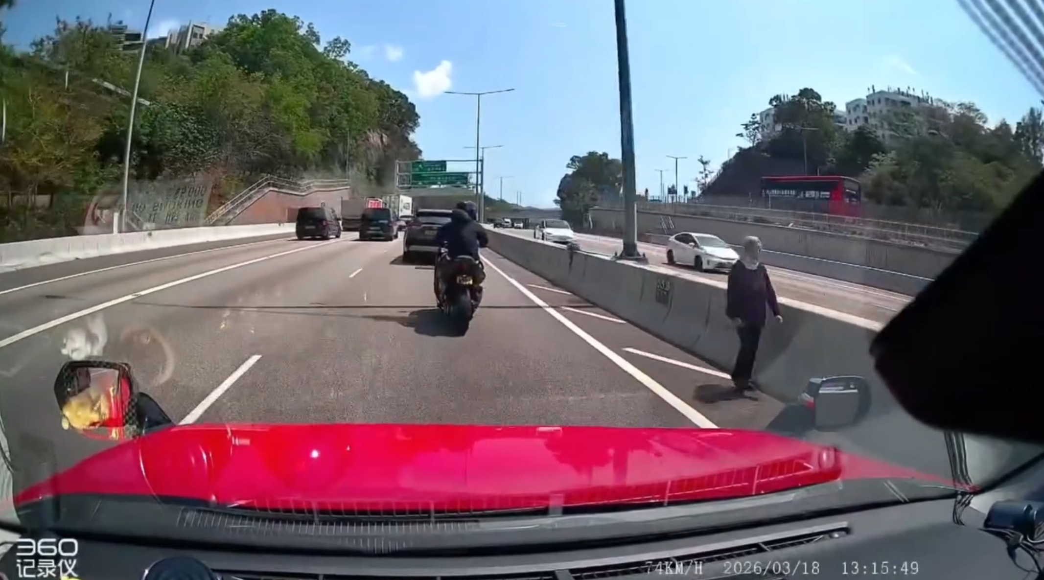 網上fb群組最新流傳一段車Cam視頻,可見一名身穿黑色長衫褲戴頭罩的婆婆,下午於屯門公路快線旁的影線逆線散步,事出突然嚇煞司機。