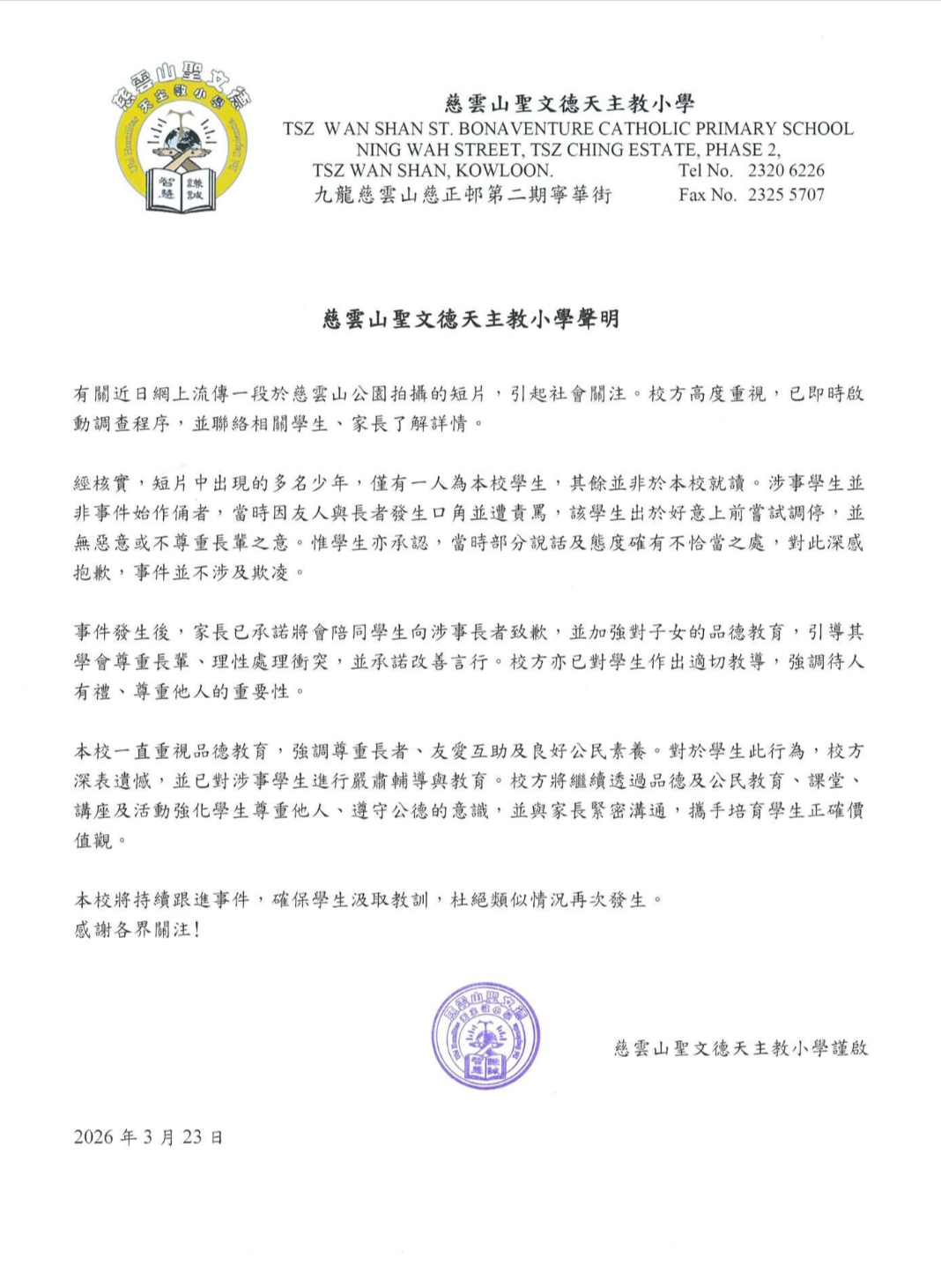 慈雲山聖文德天主教小學於聲明中表示,校方高度重視有關事件,已即時啟動調查程序,聯絡涉事學生及家長了解情況,並證實片段中只有一人為該校學生。校方引述該名學生解釋,指自己並非事件的始作俑者,事發時因友人與長者發生口角並遭責罵,出於好意上前嘗試調停,並無惡意或刻意不尊重長輩。