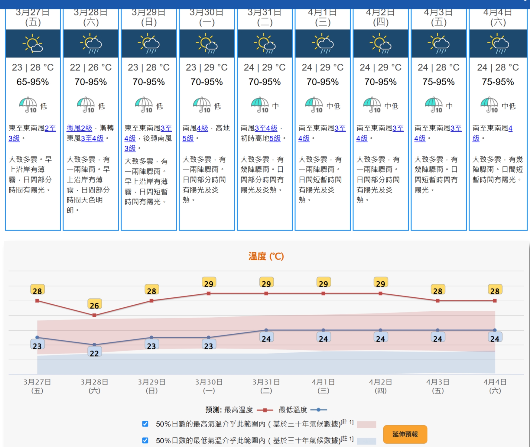 根據天文台最新九天天氣預報顯示,周六起最少連續8天有雨,本周日起多天市區最高氣温接近30度,預料介乎28至29度。