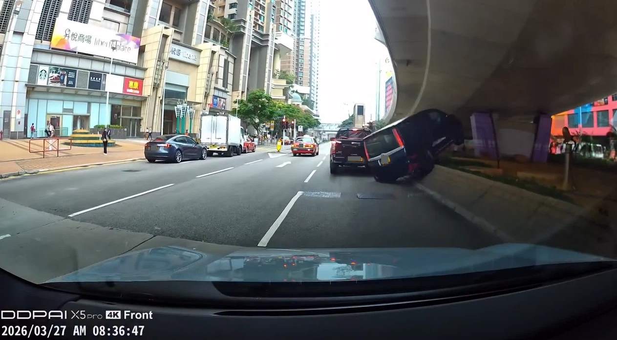 該車Cam視頻可見,事發在周五 (3月27日) 早上8時許,當時一輛客貨車沿荔枝角道駛往葵涌及荃灣方向,駛至近宇晴軒轉右彎位時,懷疑失控直接剷上天橋底石壆花槽,整架車擱在石壆上。
