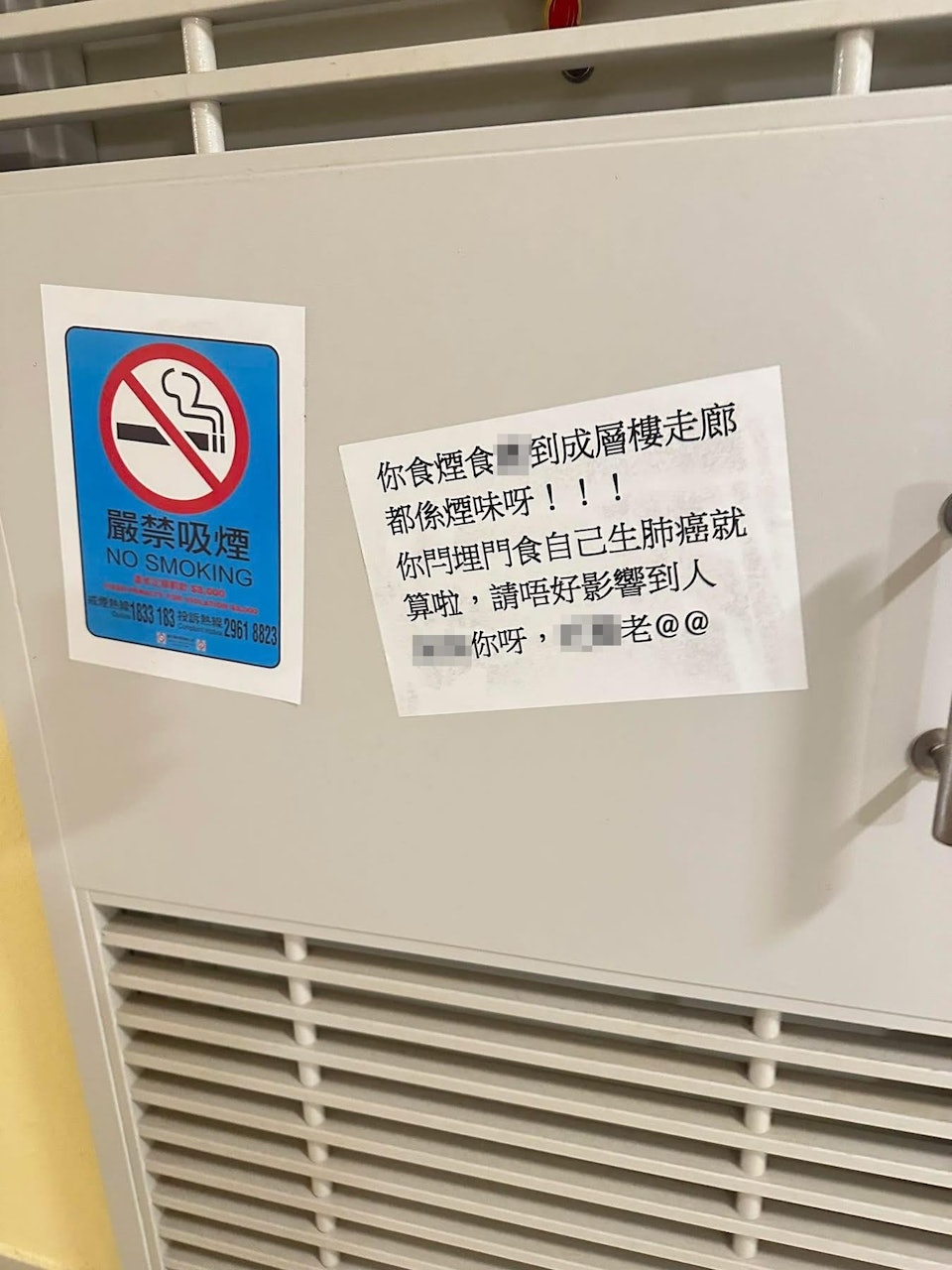 該圖片中可見一個公屋單位的鐵閘上貼有1張A4紙,寫道「你食煙食X到成層樓走廊都係煙味呀!你閂埋門食自己生肺癌就算啦,請唔好影響到人,XX你呀,XX老」,旁邊再貼有1張「嚴禁吸煙」告示,疑似有鄰居不滿該住戶的吸煙行為。