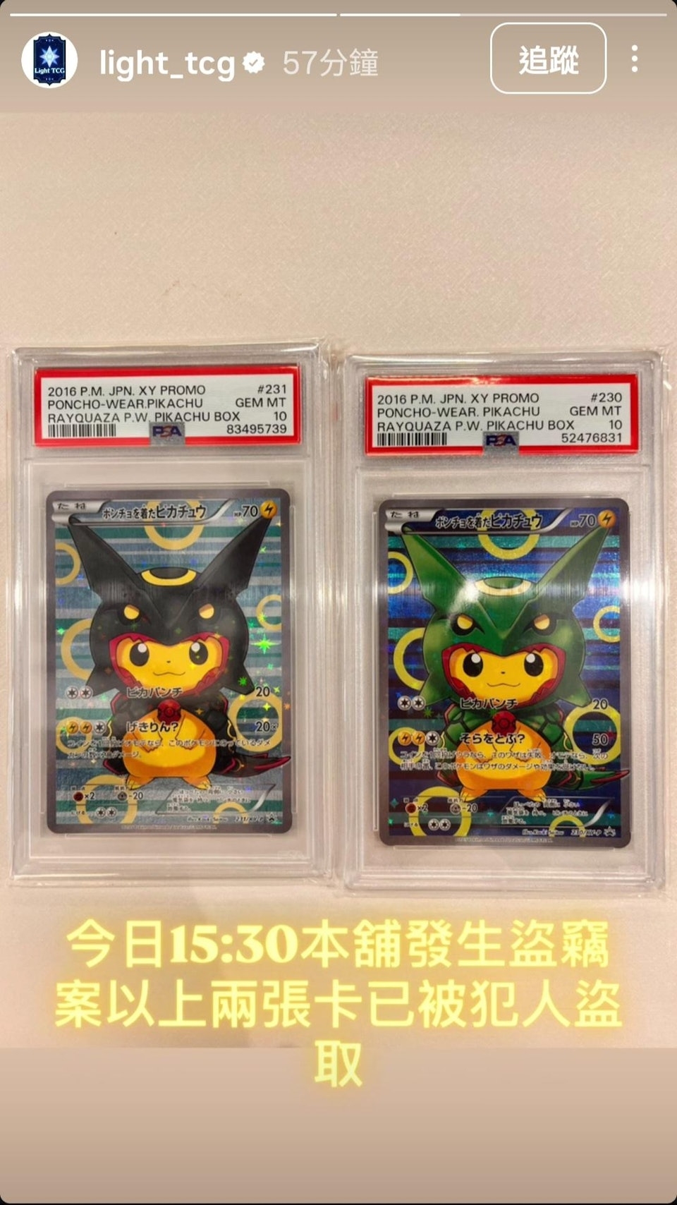 涉事的卡牌店也在社交平台貼文,指被偷的2張Pokémon卡為PSA 10滿分的「裂空座變裝比卡超」。資料顯示,該2張Pokémon卡於2016年7月6日在日本推出,是在限定時間內發售的特別版卡牌,卡上的比卡超身披廣受粉絲歡迎的超級進化版烈空坐X和Y的外衣。