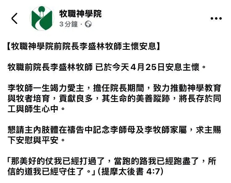 牧職神學院發布的消息寫道「牧職前院長李盛林牧師 已於今天4月25日安息主懷。李牧師一生竭力愛主,擔任院長期間,致力推動神學教育與牧者培育,貢獻良多,其生命的美善蹤跡,將長存於同工與師生心中。懇請主內肢體在禱告中記念李師母及李牧師家屬,求主賜下安慰與平安。『那美好的仗我已經打過了,當跑的路我已經跑盡了,所信的道我已經守住了。』(提摩太後書 4:7)」