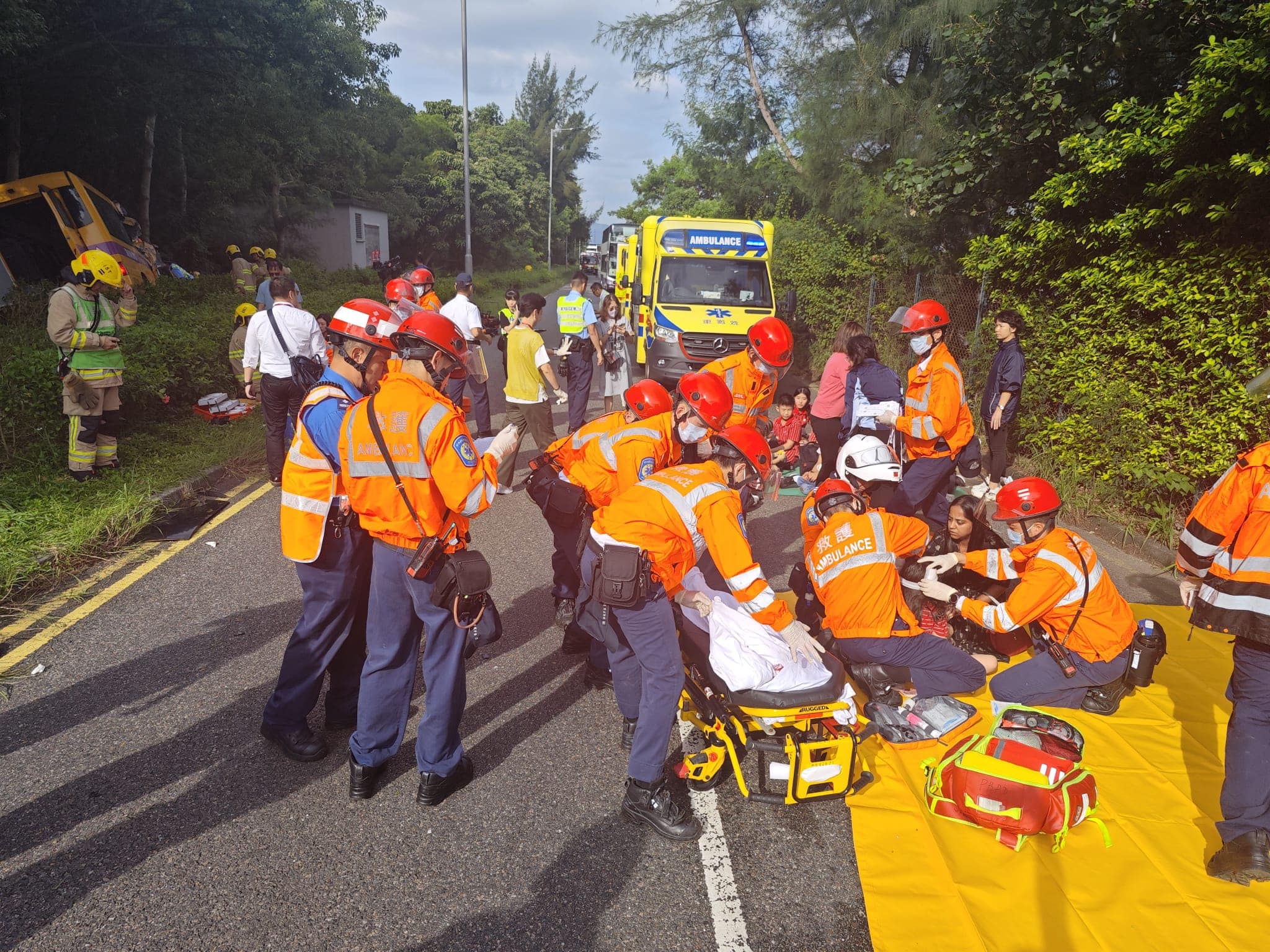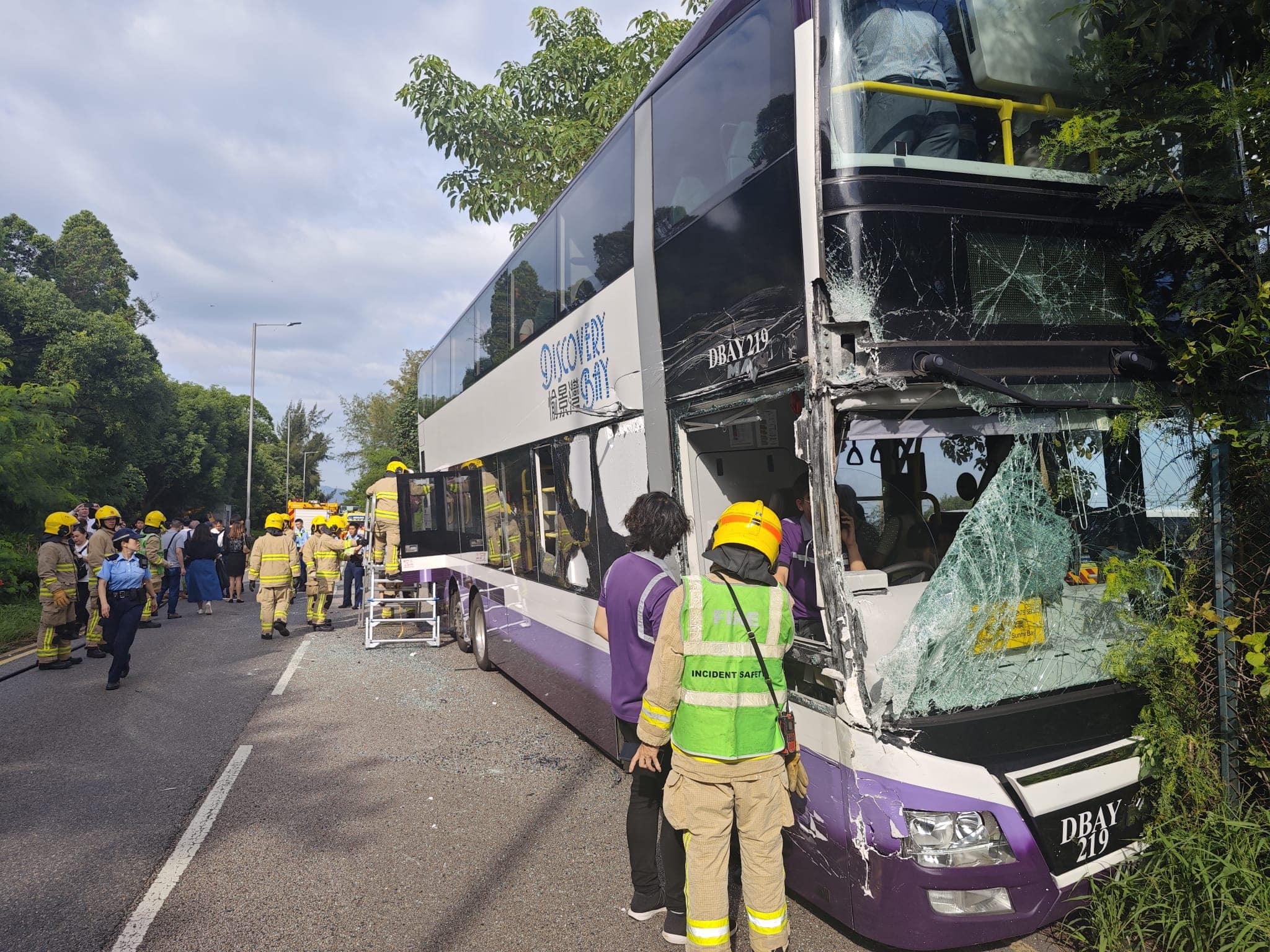 現場可見,校巴失控衝入草叢,巴士車頭玻璃碎裂,乘客要按消防指示在逃生門離開,現場有大批乘客受傷,即場接受治理。