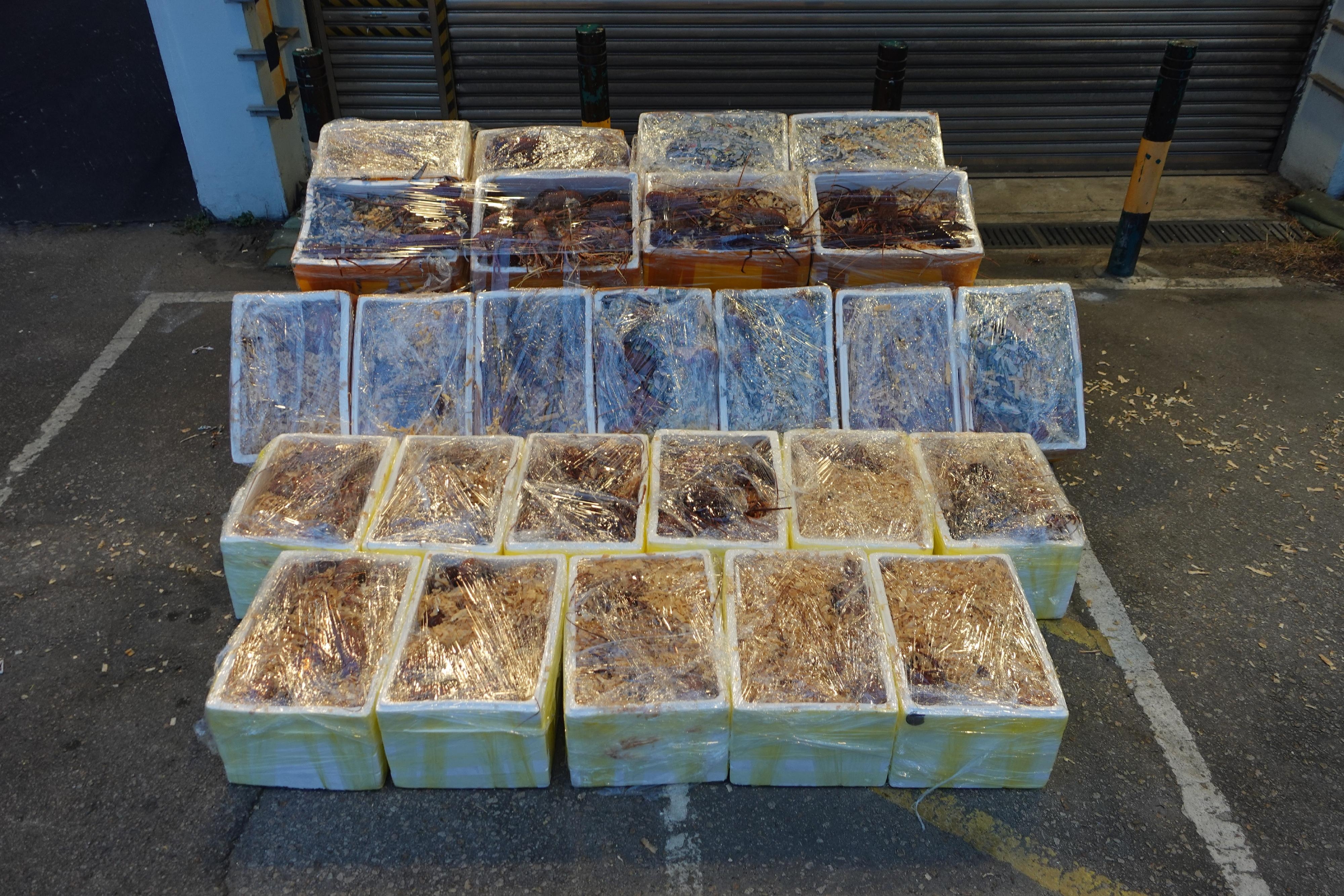 海關昨日根據風險評估,在文錦渡管制站截查一輛報稱空載的出境貨車。經查驗後,海關人員在車斗內發現一堆發泡膠箱,並在其中二十六個發泡膠箱中檢獲該批懷疑走私活龍蝦。