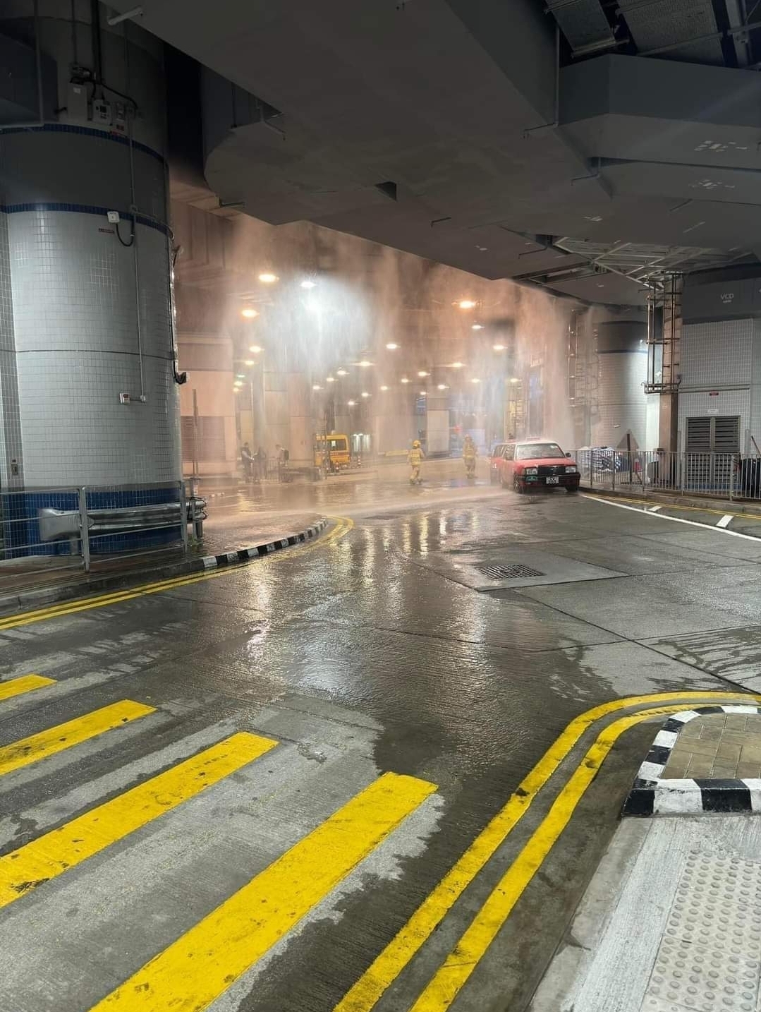 大圍交通交匯處爆水喉出現水舞間。從網傳照片見到,現場泊了數輛的士,有的士被水淋到。有消防已到場處理。