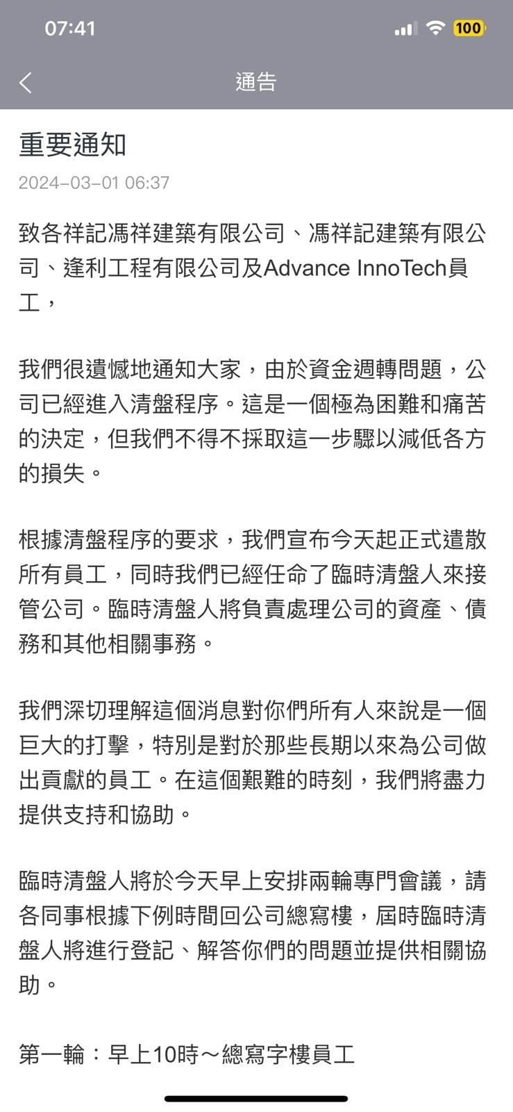 網上流傳馮祥記的員工通告,可見公司表示因資金周轉問題,今日起正式遣散所有員工,同時任命臨時清盤人接管公司,形容「這是一個極為困難和痛苦的決定,但我們不得不採取這一步驟以減低各方的損失」。