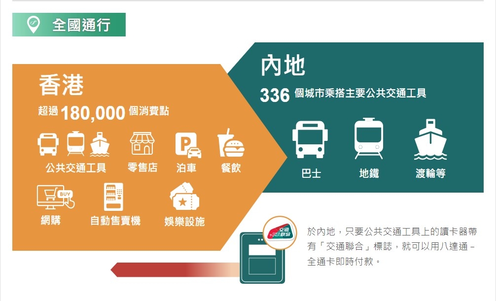 八達通現推出「全國交通一卡通互聯互通」先導體驗計劃。巿民可於指定銷售點購買八達通 - 全國通卡首創版,於香港超過18萬個消費點如常拍卡消費的同時,嘟勻內地336個城市乘搭公共交通,享受全國周圍去的便利。