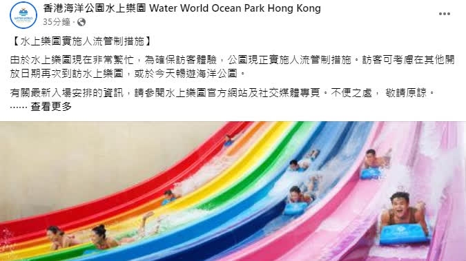 海洋公園今日(29日)於社交媒體發文表示,由於水上樂園現在非常繁忙,為確保訪客體驗,公園現正實施人流管制措施,呼籲訪客可考慮在其他開放日期再次到訪水上樂園。