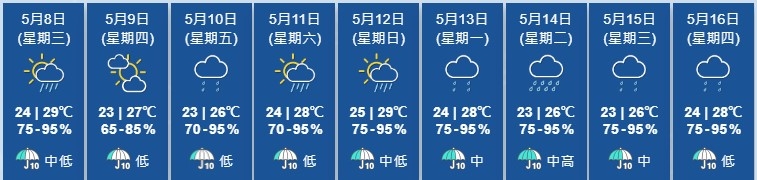 天文台指,一股清勁至強風程度的偏東氣流會在未來一兩日影響廣東沿岸,該區雲量較多及有幾陣驟雨。而偏東氣流會在週末期間被一股偏南氣流取代,沿岸地區天氣炎熱,亦有幾陣驟雨。受高空擾動影響,下週初至中期華南沿岸天氣不穩定。