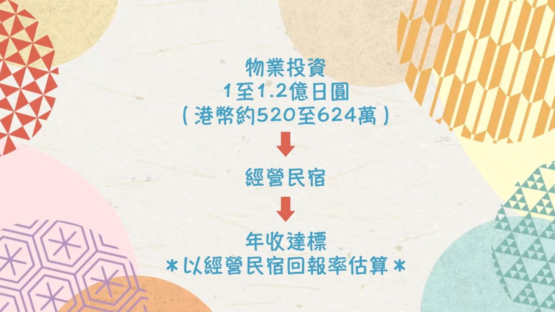 由於投資房地產收入相對穩定,尤其作為民宿出租,當地因為涉及經營及管理;而上述兩項條件,對申請 「經營管理簽證」非常重要!計算400至600萬日圓的收入,約需要購買1至1.2億日圓(即約520至624萬港元)的房地產,每年續簽,就會相對容易。