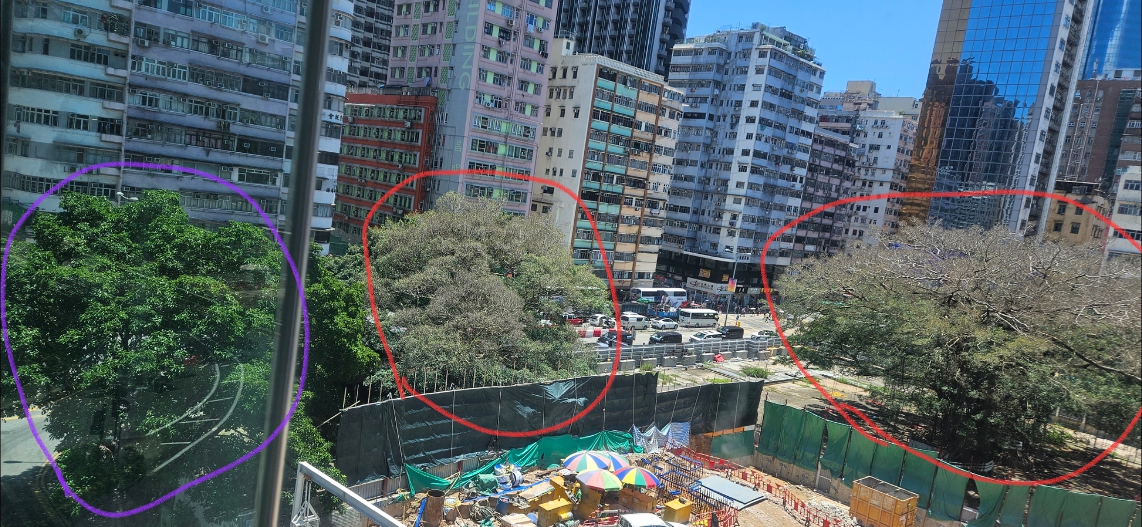 觀眾趙小姐提供相片給東張,說:「經過洗衣街,看見地盤內兩棵榕樹明顯凋謝,顏色樹冠均與隔離非地盤內的榕樹有明顯分別。」