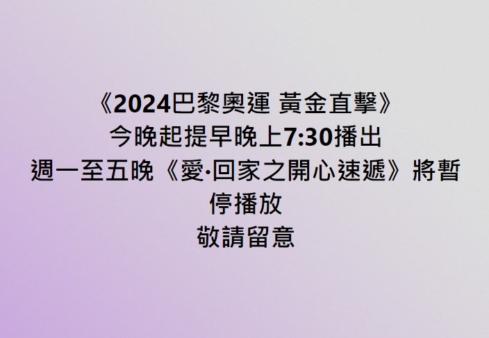 《2024巴黎奧運 黃金直擊》今晚起,提早晚上7:30播出,週一至五晚《愛·回家之開心速遞》將暫停播放。