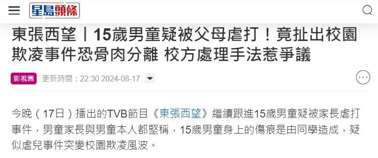 《東張西望》一連三晚跟進長洲家長劉先生被指控虐打三兒子,校方申請兒童保護令,安排三兒子入往院舍,不讓爸爸接觸兒子導致骨肉分離,但原來背後隱藏一宗更轟動的校園欺凌案。事件引起很多傳媒跟進和討論,今晚《東張西望》特別跟進背後的校園欺凌問題,揭發原來校內的惡霸早已在長洲臭名遠播,更涉及搗亂甚至偷竊。