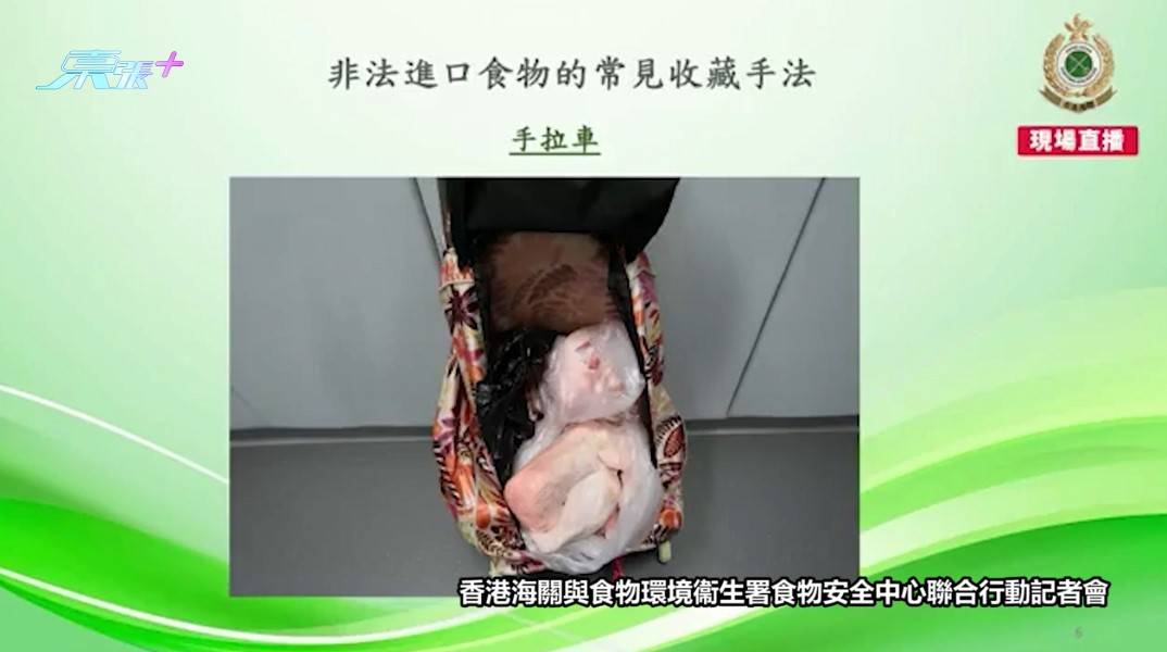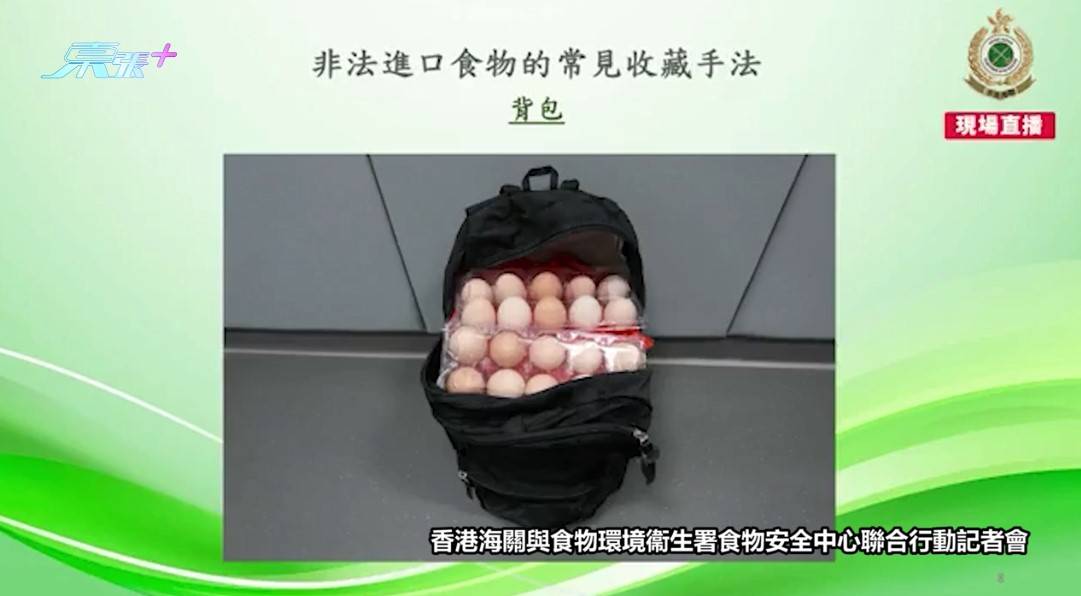 海關又說檢獲的案件食物安全有隱憂,很多衛生欠佳,有人甚至用膠袋裝載生肉回港,有旅客整個背包都載滿蛋類,他們不單攜帶牛肉、豬肉,甚至將整隻雞帶回港。有旅客誤以為把肉類「汆水」帶回港就無問題,但海關強調沒有衛生證明書的食物,不能帶入境,否則要付上刑責。