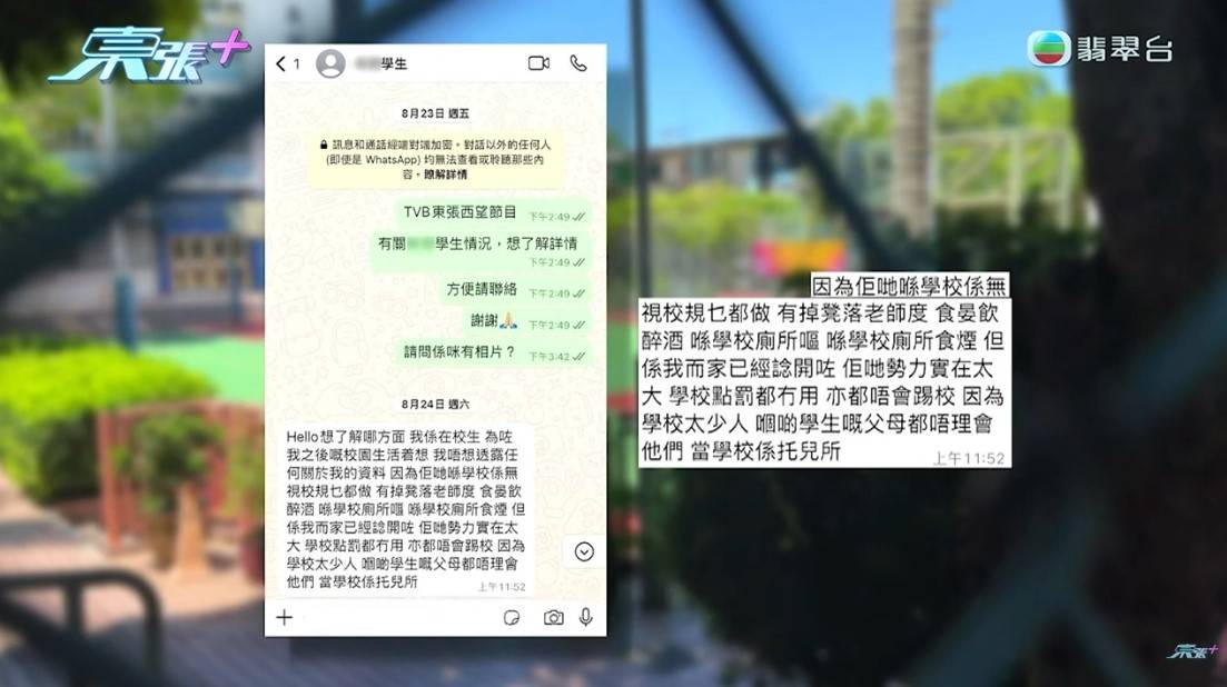 此外,有曾經在涉事中學任教的前老師更加挺身接受《東張西望》採訪,對事件深表痛心:「我真的有哭過……我覺得很奇怪,為什麼班主任好像置身事外?校長也好像沒有出現過,就只有副校長,是不是對學生、家長都不公平呢?是不是真的山高皇帝遠,是有特別的對待呢?」