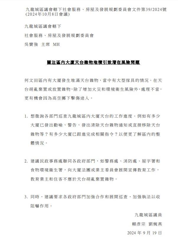 翻查區議會紀錄,九龍城區議會在9月19日的文件表明關注區內大廈天台雜物堆積引致潛在風險問題,並正在徵詢政府各部門巡查區內大廈天台的工作進度。