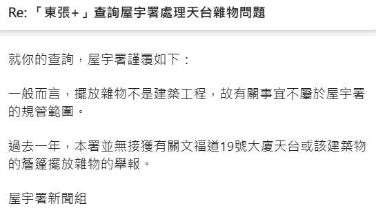 就文福道19號的天台個案,屋宇署回覆「東張+」指出,過去一年並無接獲有關文福道19號大廈天台或該建築物的簷篷擺放雜物的舉報。另外擺放雜物不是建築工程,故有關事宜不屬於屋宇署的規管範圍。