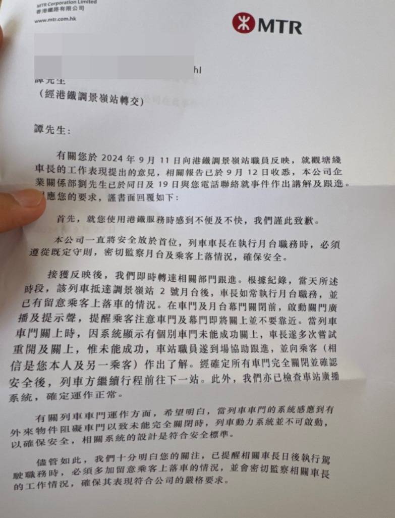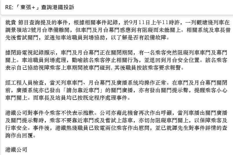 「東張+」收到譚先生投訴後,聯絡港鐵方面了解事件,港鐵回覆:「根據相關事件記錄,於9月11日上午11時許,一列觀塘綫列車在調景嶺站2號月台準備離開,但車門及月台幕門感應到有阻礙而未能關上。相關系統及車長曾先後嘗試關門,並通知車站職員到場協助,以了解是否有設備故障。」。