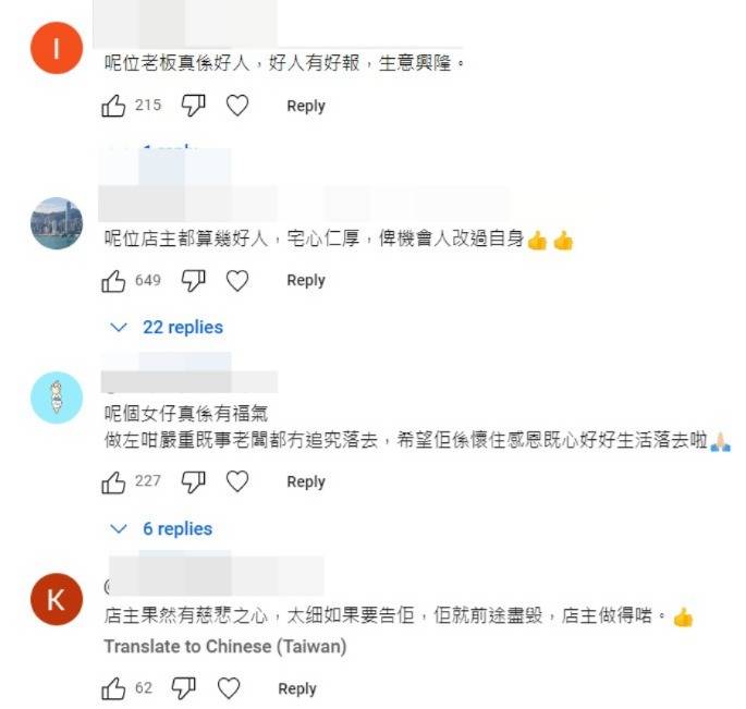 事實上,網民留言也反映社會願意包容理解的一面,很多網民都讚揚店主做法,希望少女不要浪費這一次寶貴的改過機會,改過自新。
