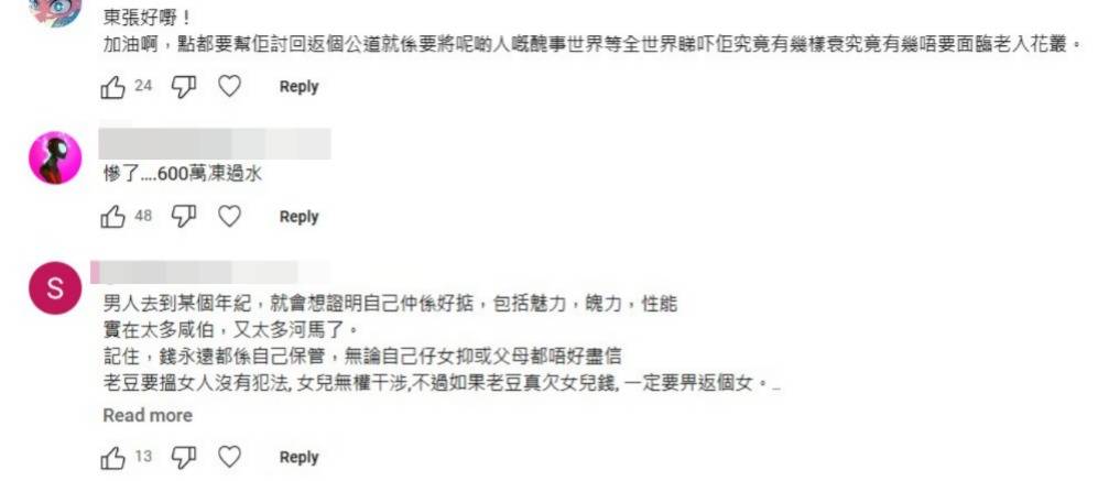 這個報道掀起很多討論,有網民坦言,所有男人都鹹濕,沒有例外,「男人去到某個年紀,就會想證明自己仲係好掂,包括魅力、魄力、性能力」。有人批評爸爸不顧父女親情,不過也有很多網民非常現實,認為錢應該由自己保管,認為其父親的確沒有義務繼續撫養她,即使再娶也實屬正常,女兒也應該要有獨立經濟能力,討回自己的金錢,但父親的感情事,實在不應過分干涉,否則父女反目蝕底的是自己。