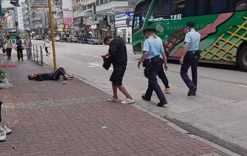 後來男子更直接倒在地上,有途人擔心出事報警,兩名警員到場後,男子好像有點知覺,由兩名警員攙扶到公園附近休息。
