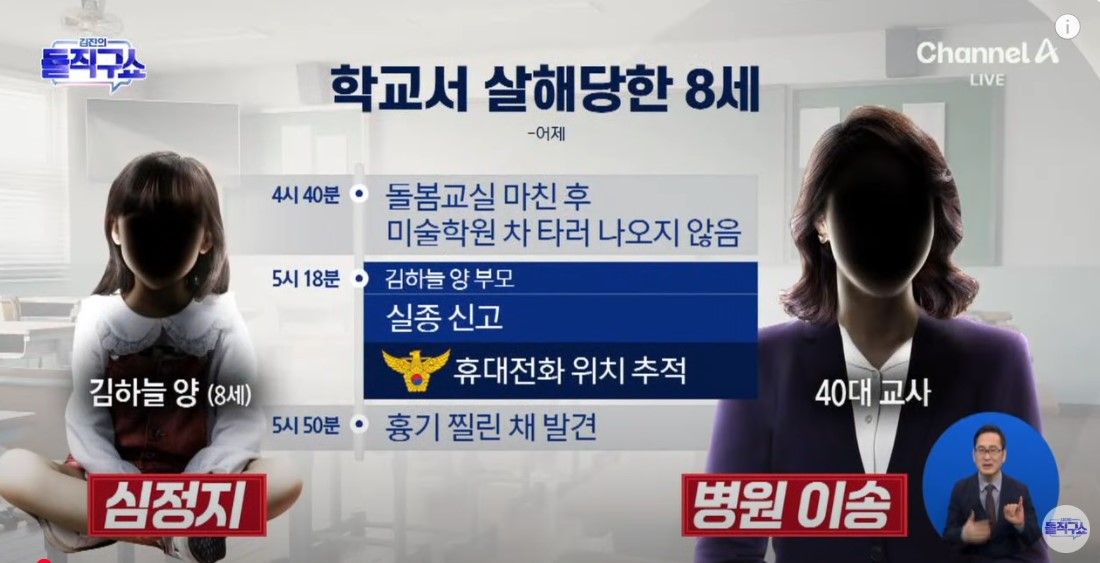 整理南韓報道指出,女教師跟女童說有一本書要送給她,將女童誘拐到視聽教室,但其實當天已購買兇器準備行兇。女童身體、頸部及臉部多處被嚴重刺傷,最終搶救無效身亡,女教師則頸部及手腕有傷口。
