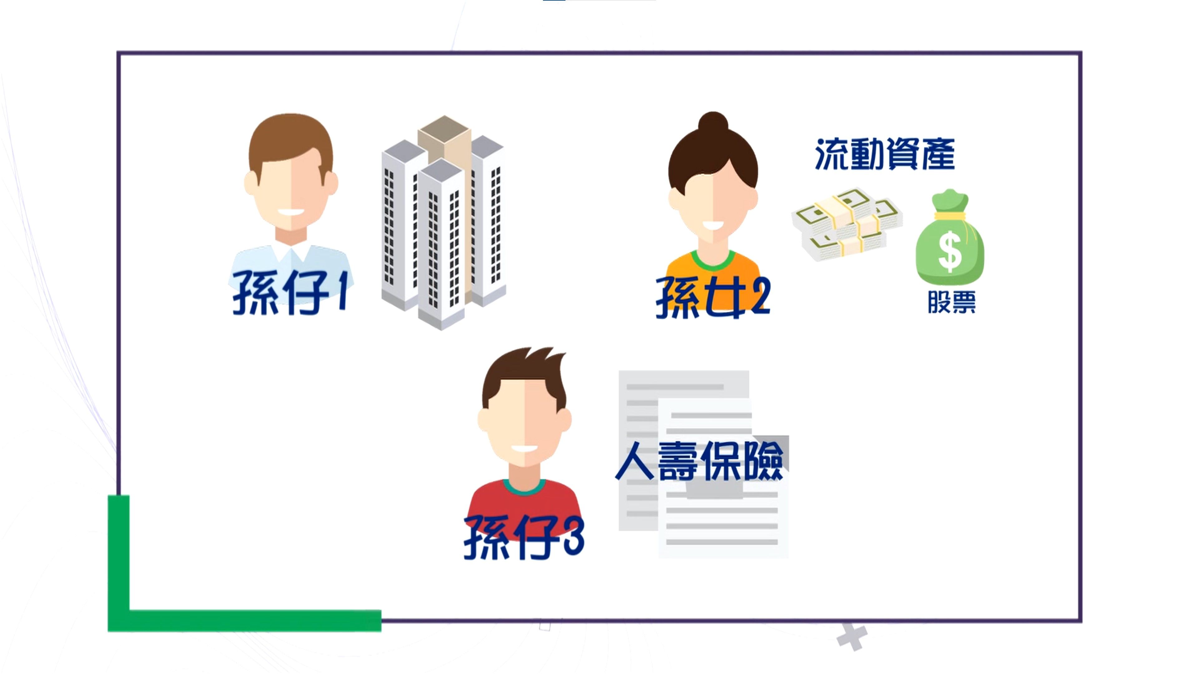 他舉例指,客戶擁有一個物業,並擁有一些流動資產如現金、股票等等,而客戶希望將資產留給三個孫,本來物業及流動資產的價值是相若,所以可以分為兩份;而客戶亦購入了一份人壽保險,而保障額亦相等於資產價值,這樣就可以保障每一位孫都可以得到差不多的資產分配,避免將來有爭拗。