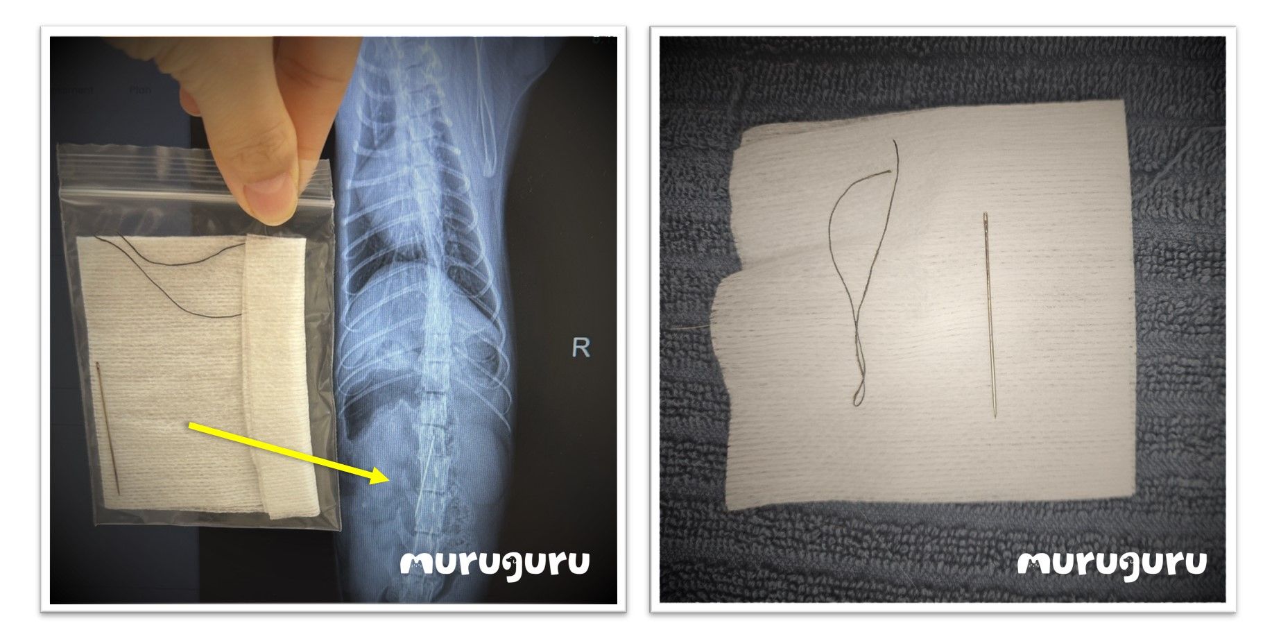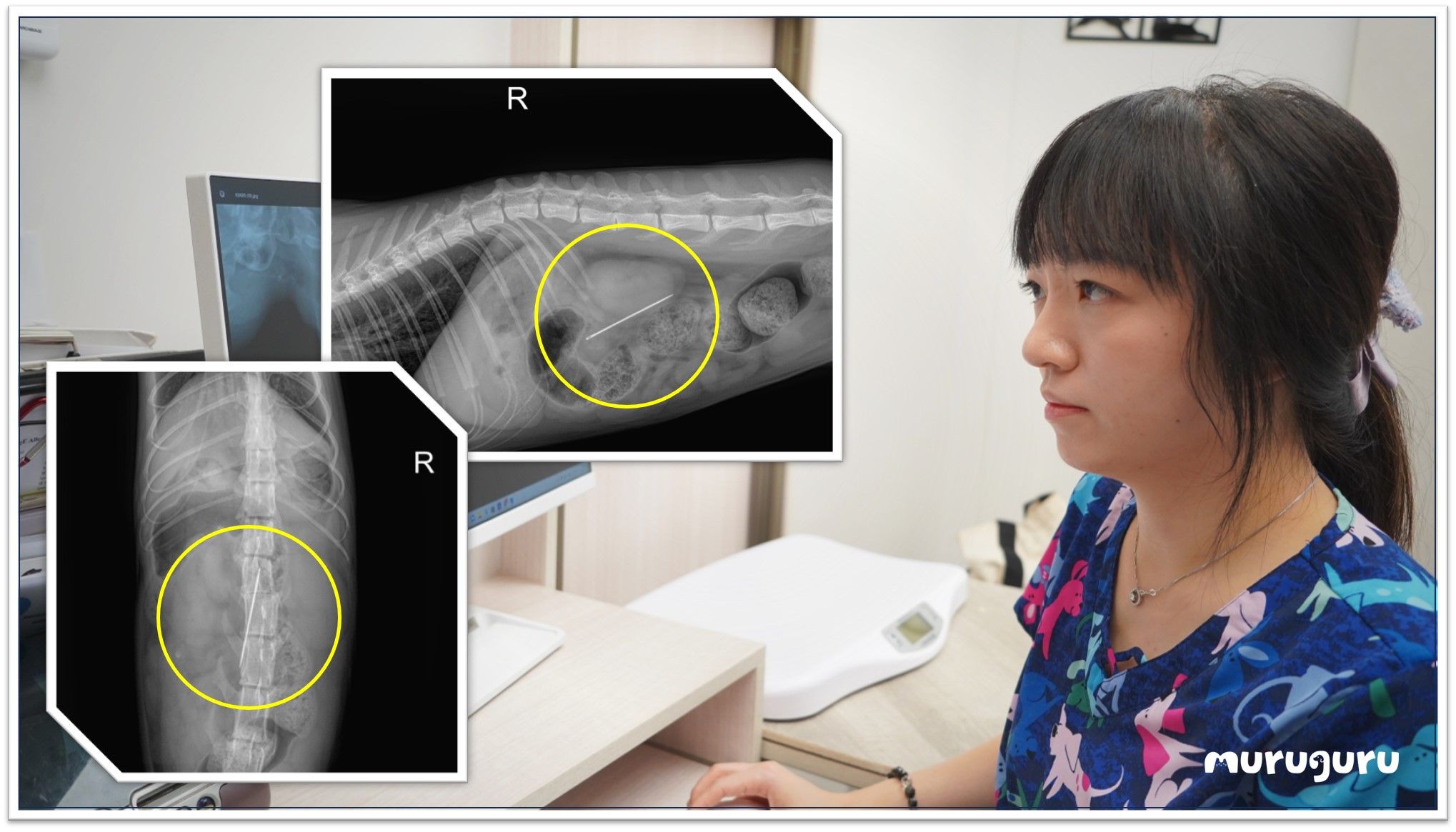 Dr. Doris立即為波子進行臨床檢查,利用X光發現牠的中腹部有一根尖銳的異物,很可能就是失蹤的針。由於X光影像的平面限制,難以確定針是否刺穿內臟,因此Dr. Doris使用超聲波進一步檢查。幸好,超聲波未顯示出任何出血或腹腔積水的跡象,從而可以推斷針並未刺穿腸道或其他器官。不過,隨着針在波子體內停留的時間越長,風險也越高。一旦刺穿內臟,可能導致胃液或食物流入腹腔,進而引發腹膜炎,所以Dr. Doris決定進行緊急手術取出針線。