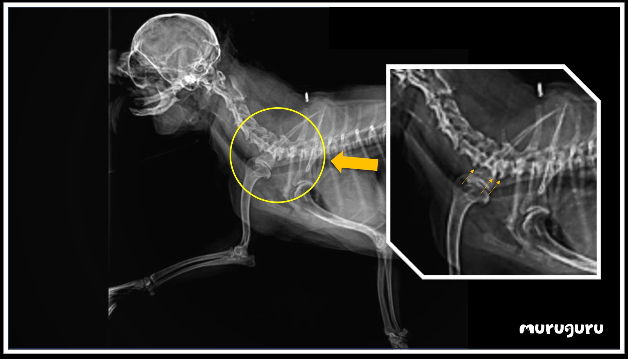 在老年貓狗中,骨刺是一種相當常見的毛病,通常在兩塊骨骼的交界處出現骨質增生。根據X光影像,波波的第五至七節頸椎出現了微小的骨刺,雖然數量不多,但突出來壓迫了傳遞去右手的神經線,對神經傳遞造成影響,結果右手失去了神經反射,導致癱瘓的情況發生。
