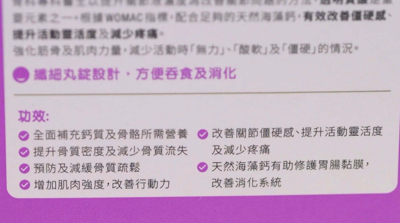 此外,鈣片若添加透明質酸,能夠幫助有痛症的人,例如關節痛、腰背痛或肩頸痛。他解釋:「因為透明質酸有助於提升關節液的濃度,改善關節問題,減少僵硬感和疼痛。」