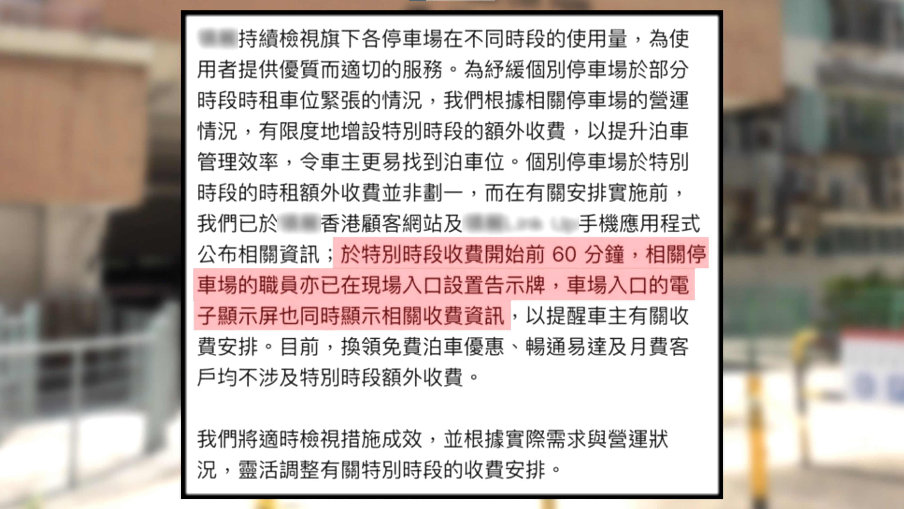 《東張》就此事向商場所屬集團查詢,回覆指增設特別時段額外收費,是為了舒緩個別停車場部份時段時租車位緊張的情況,於實施前的60分鐘,職員會於停車場入口設置告示牌,並於電子顯示屏顯示相關收費資訊。