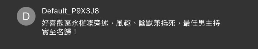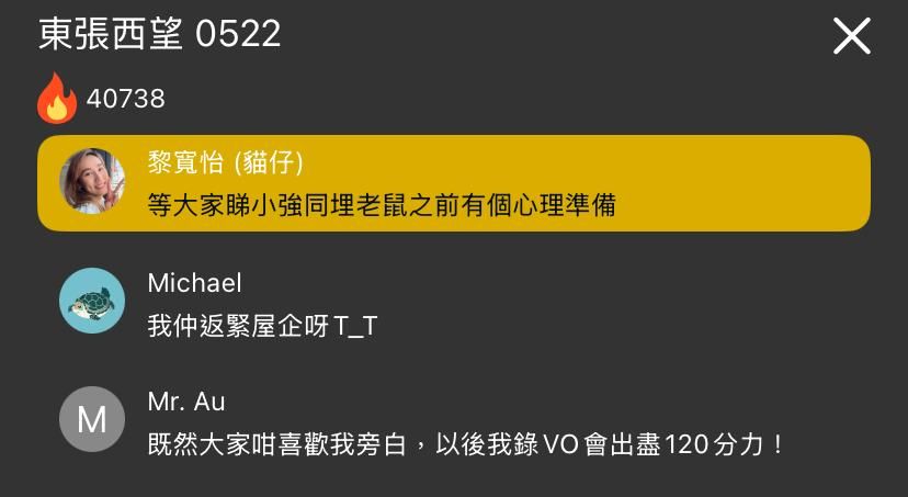 之後有位網民叫「Mr.Au」原來就是主持區永權,他更向「貓仔」打招呼,引起討論區一陣騷動!有人即時當面讚美他的旁述!