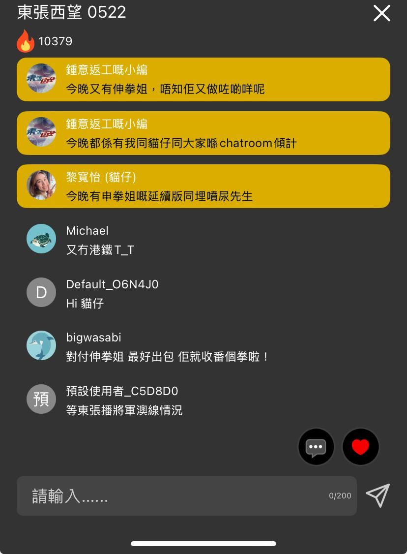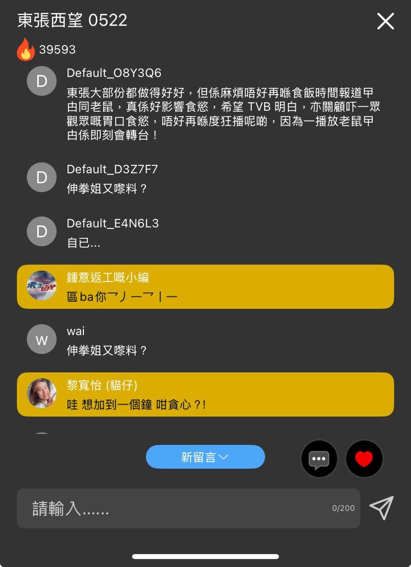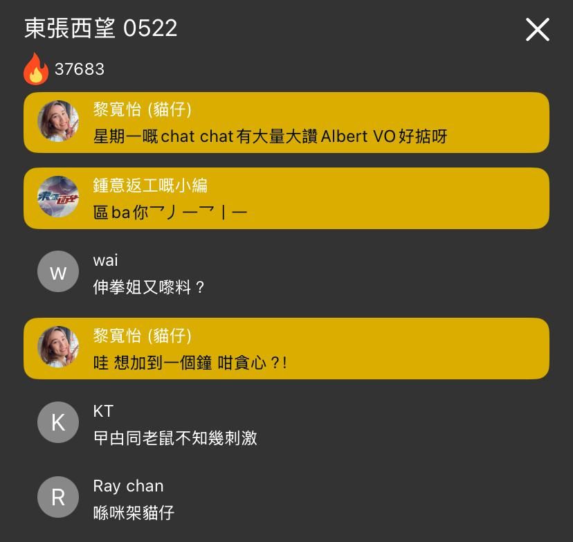 《東張西望》今晚開始,逢週一及週四在myTV SUPER加推3分鐘獨家故事,新開直播討論區,數以萬計瀏覽熱度邊看《東張西望》,一邊看留言,今晚除了有主持黎寬怡「貓仔」以及小編進駐,連星級主持區永權都加入一起討論,區永權加入時,更加引起一陣哄動!