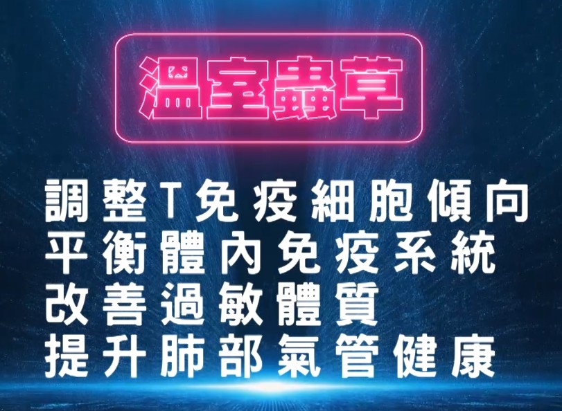 註冊營養師Chris介紹溫室蟲草功效,他說許多人出現鼻敏感,主要是因為免疫系統失衡,常見症狀包括鼻敏感、氣管不適、咳嗽,甚至皮膚紅腫。他指近年多項醫學研究證實,溫室蟲草能夠調整T免疫細胞傾向,平衡體內免疫系統,從而改善過敏體質,提升肺部及氣管健康。