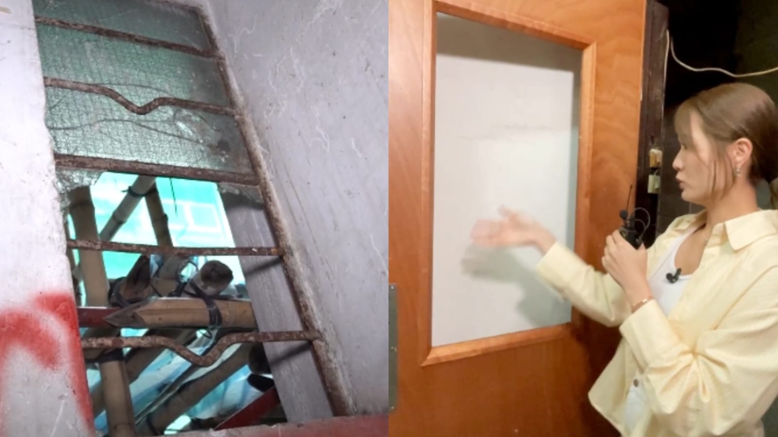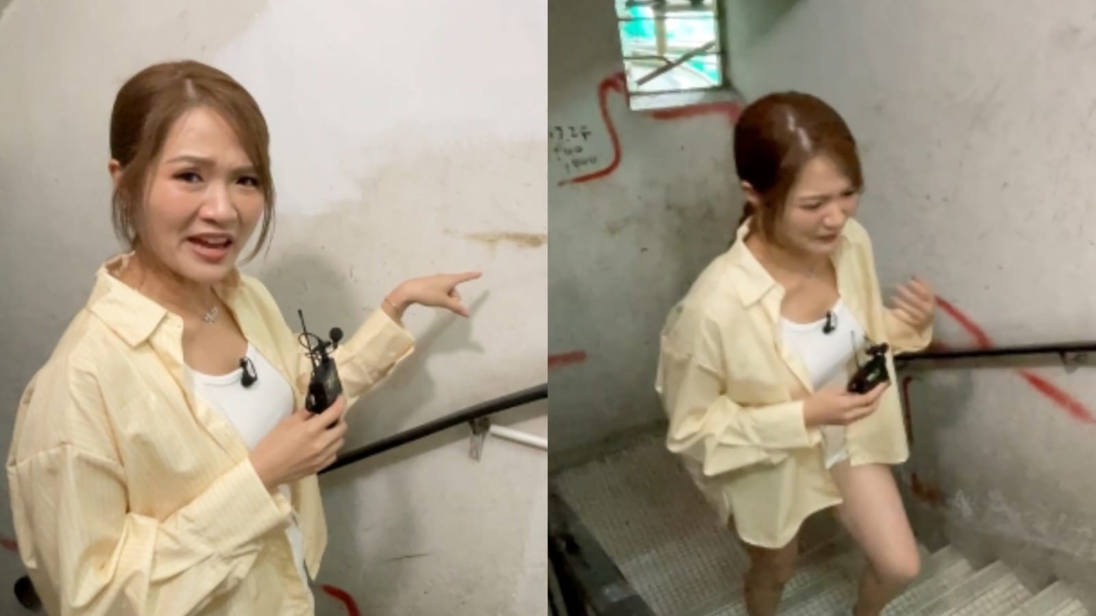 東張主持梁敏巧親身到唐樓視察,就聞到尿騷味,牆身啡色的污漬懷疑是大便!所見防火門、後樓梯窗戶的玻璃全部被打爛。